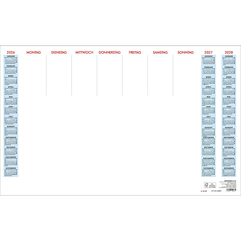 Die Zettler Schreibunterlage ohne Schutzleiste 2026 ist der ideale Begleiter für den Arbeitsalltag. Sie kombiniert einen praktischen Wochenplaner mit ausreichend Platz für Notizen und schützt gleichzeitig Ihren Schreibtisch. Kalendertyp: Schreibunterlage Typ ...
