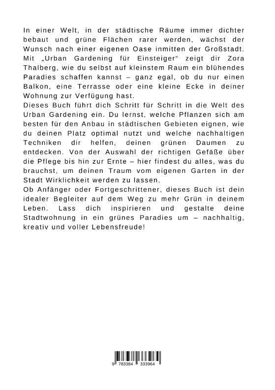 In einer Welt, in der städtische Räume immer dichter bebaut und grüne Flächen rarer werden, wächst der Wunsch nach einer eigenen Oase inmitten der Großstadt. Mit Urban Gardening für Einsteiger zeigt dir Zora Thalberg, wie du selbst auf kleinstem Raum ein blühe...