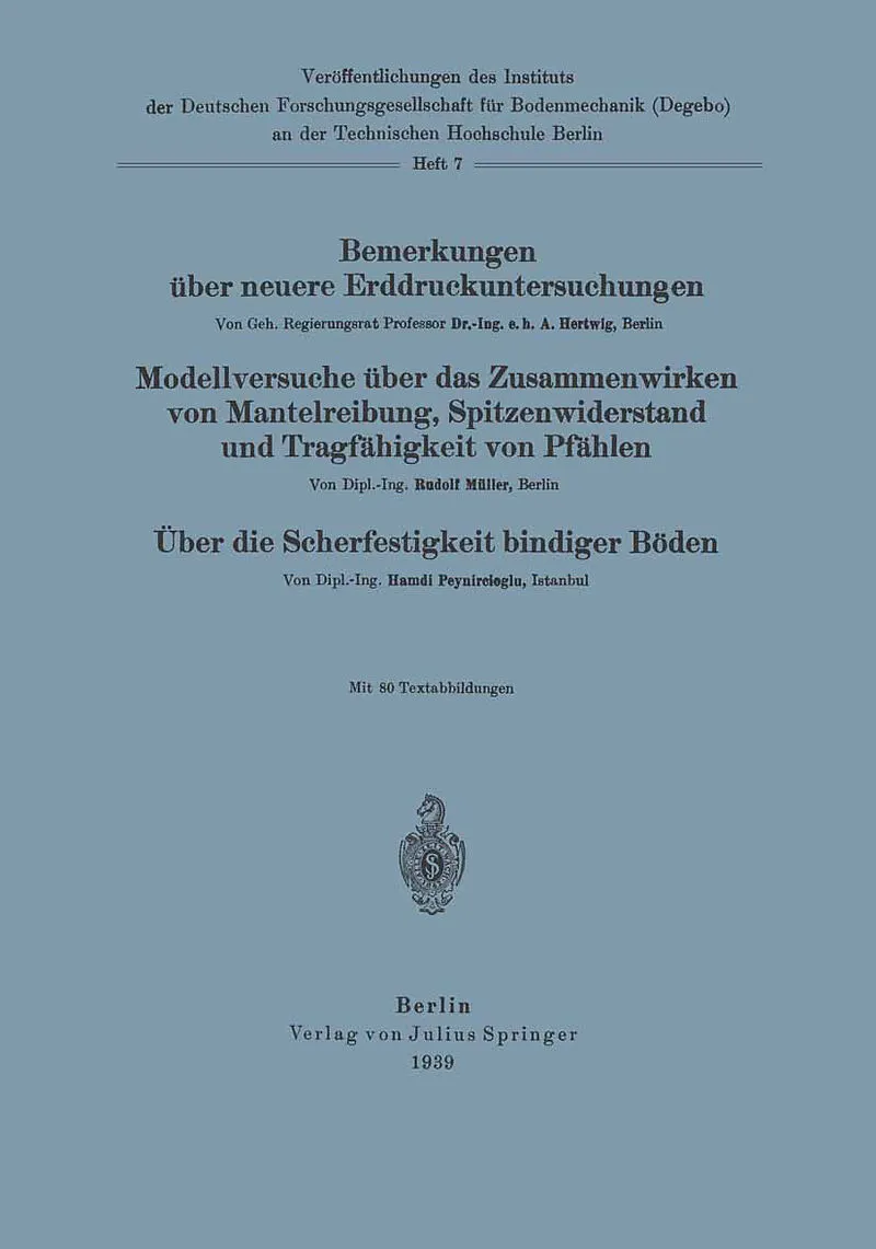 Bemerkungen über neuere Erddruckuntersuchungen. Modellversuche über Zusammenwirken von Mantelreibung, Spitzenwiderstand und Tragfähigkeit von Pfählen. Über die Scherfestigkeit bindiger Böden