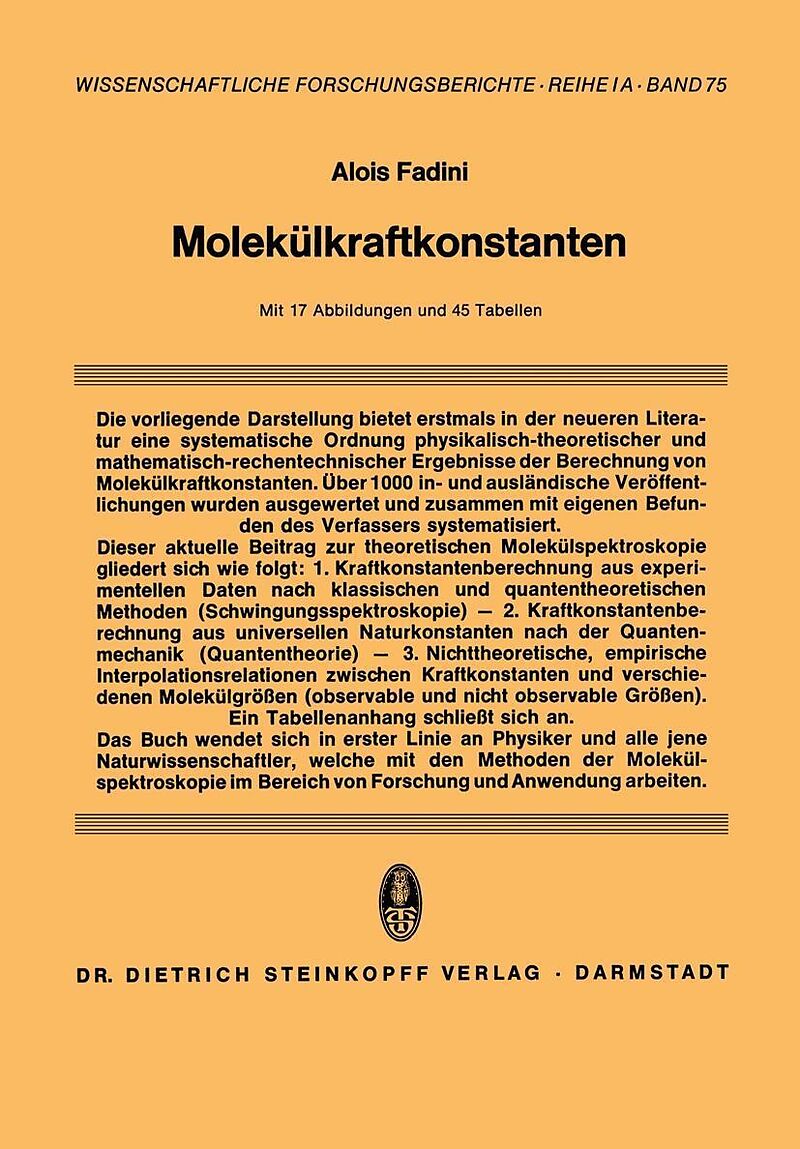 Wissenschaftliche Forschungsberichte, Reihe I, Abt.A,Band 75 Klappentext Wissenschaftliche Forschungsberichte, Reihe I, Abt.A,Band 75 Inhalt 0. Einleitung.- 1. Molekülschwingungen.- 2. Kraftkonstantenberechnung eines 2-Massensystems aus der Schwingungsfrequen...