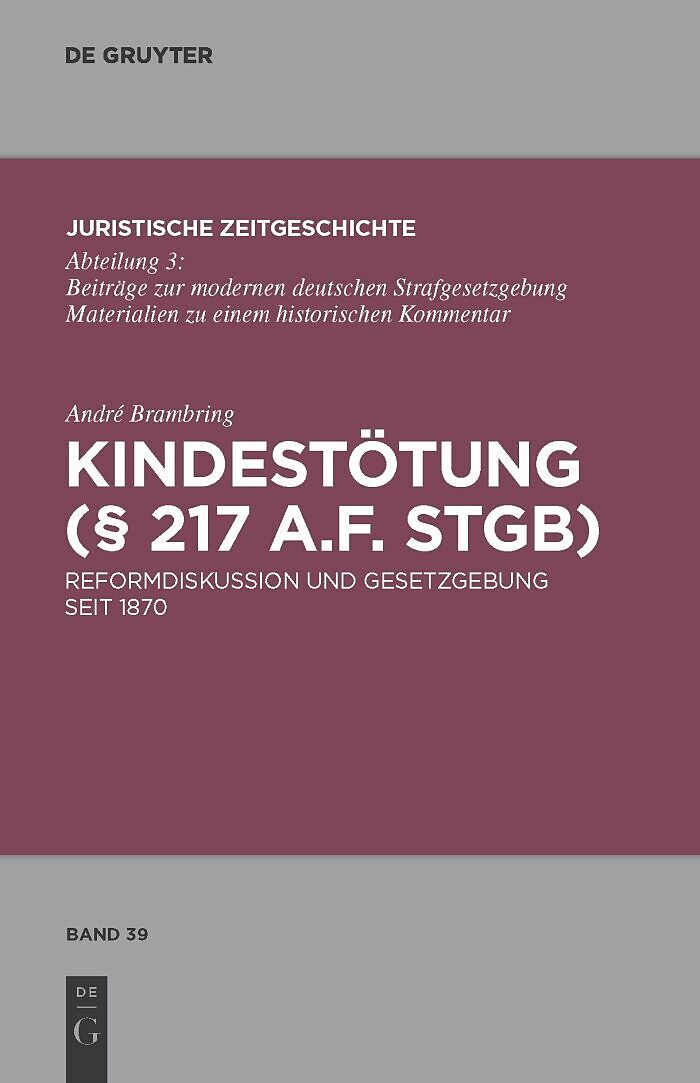 The subject of this work is the reform debate and legislation pertaining to the facts of the case as set out in §217 of the old version of the German Criminal Code (StGB) from 1870 until its annulment under the Sixth Criminal Law Reform Act (StrRG) on 1 April ...