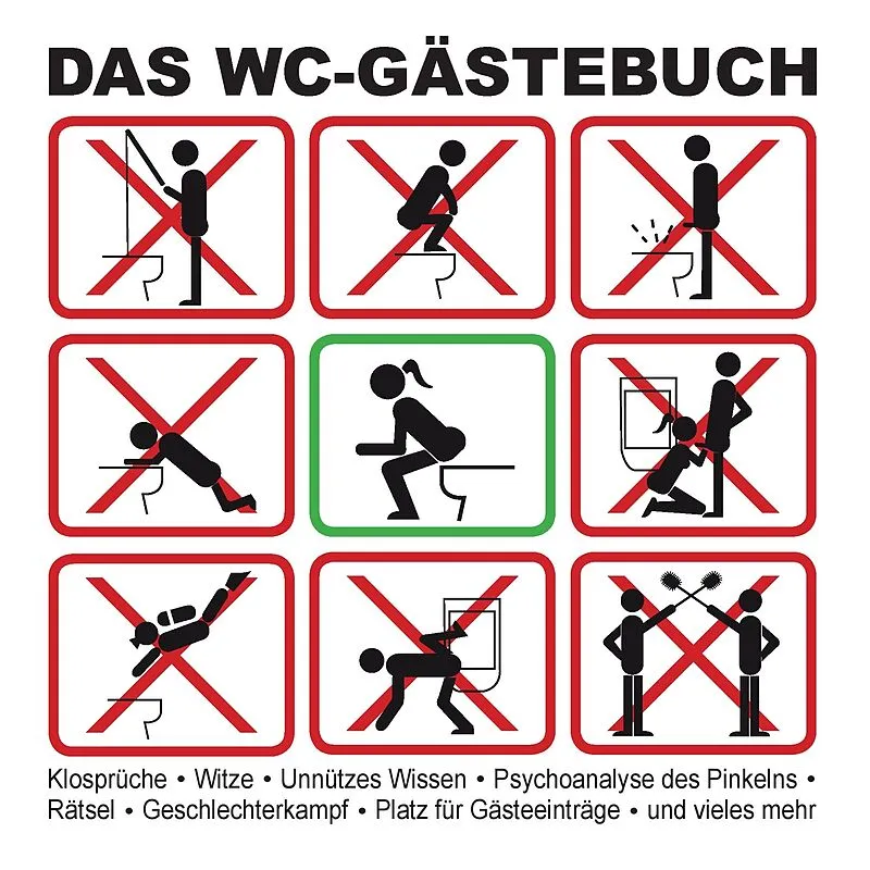 Große Unterhaltung auch auf dem WC mit: - Gasteintrag-Seiten mit Fragebogen - Der Geschichte der Toilette - Klosprüchen - Witzen - Unnützem Wissen - Der Psychoanalyse des Pinkelns - Rätseln - Themen zum Kampf der Geschlechter - Fußballsprüchen - Vielen anderen...