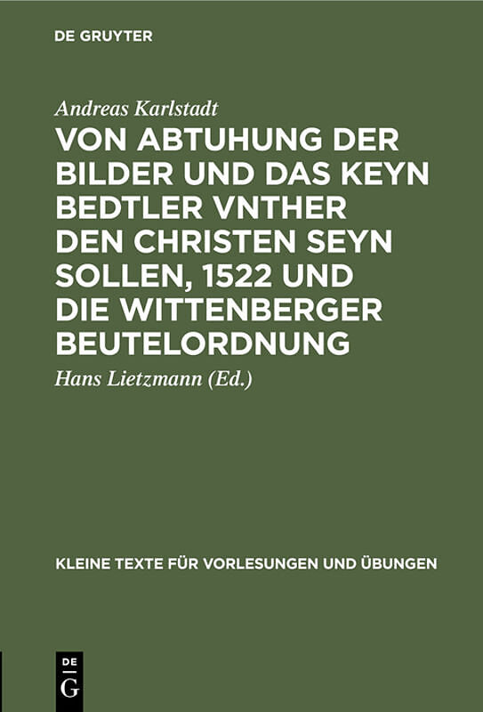 Frontmatter -- ANDREAS KARLSTADT VON ABTUHUNG DER BILDER UND DAS KEYN BEDTLER VNTHER DEN CHRISTEN SEYN SOLLEN 1522 UND DIE WITTENBERGER BEUTELORDNUNG HERAUSGEGEBEN -- Backmatter Zusammenfassung KARLSTADT: VON ABTUHUNG DER BILDER UND DAS KLT 74 E-BOOK...