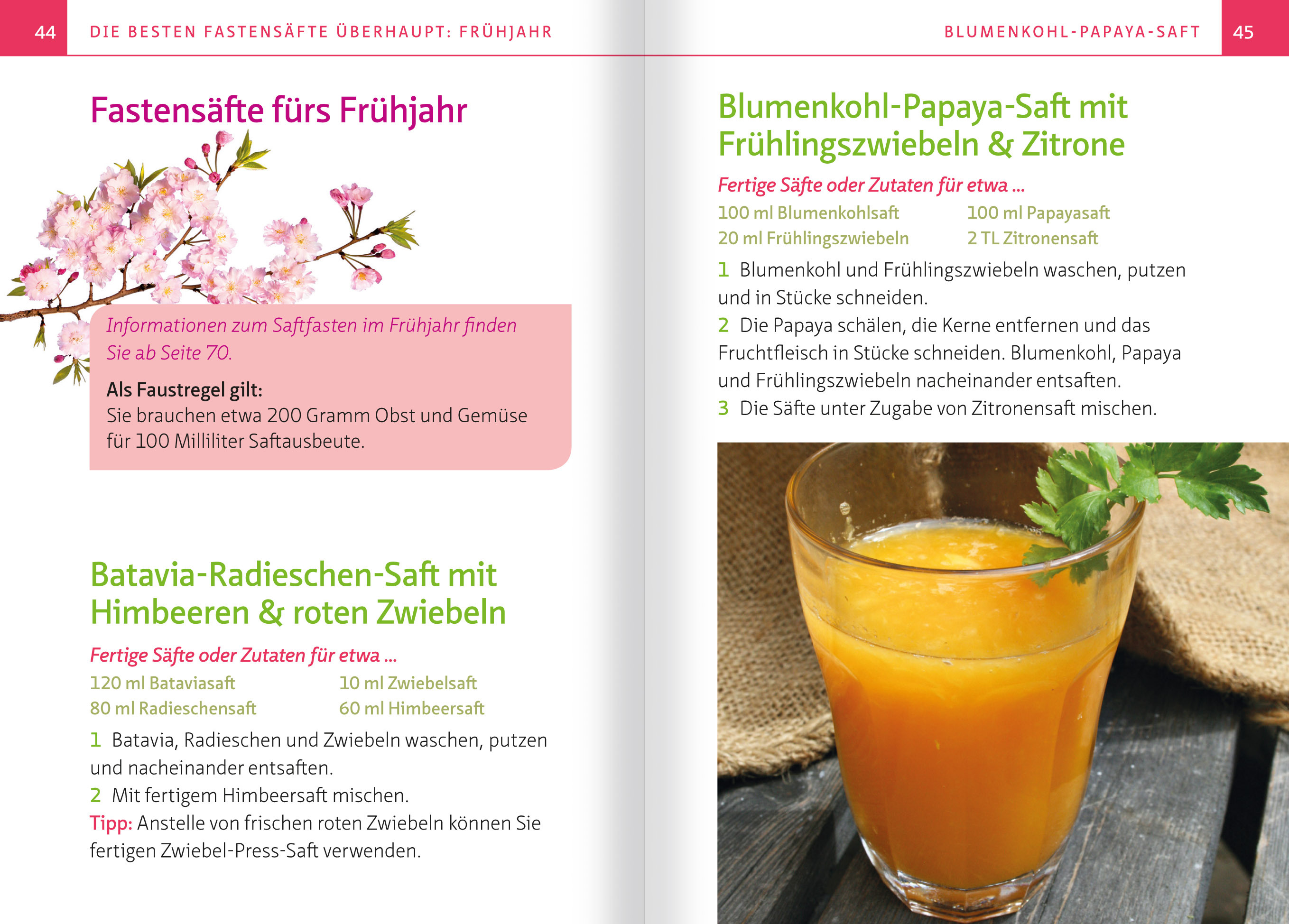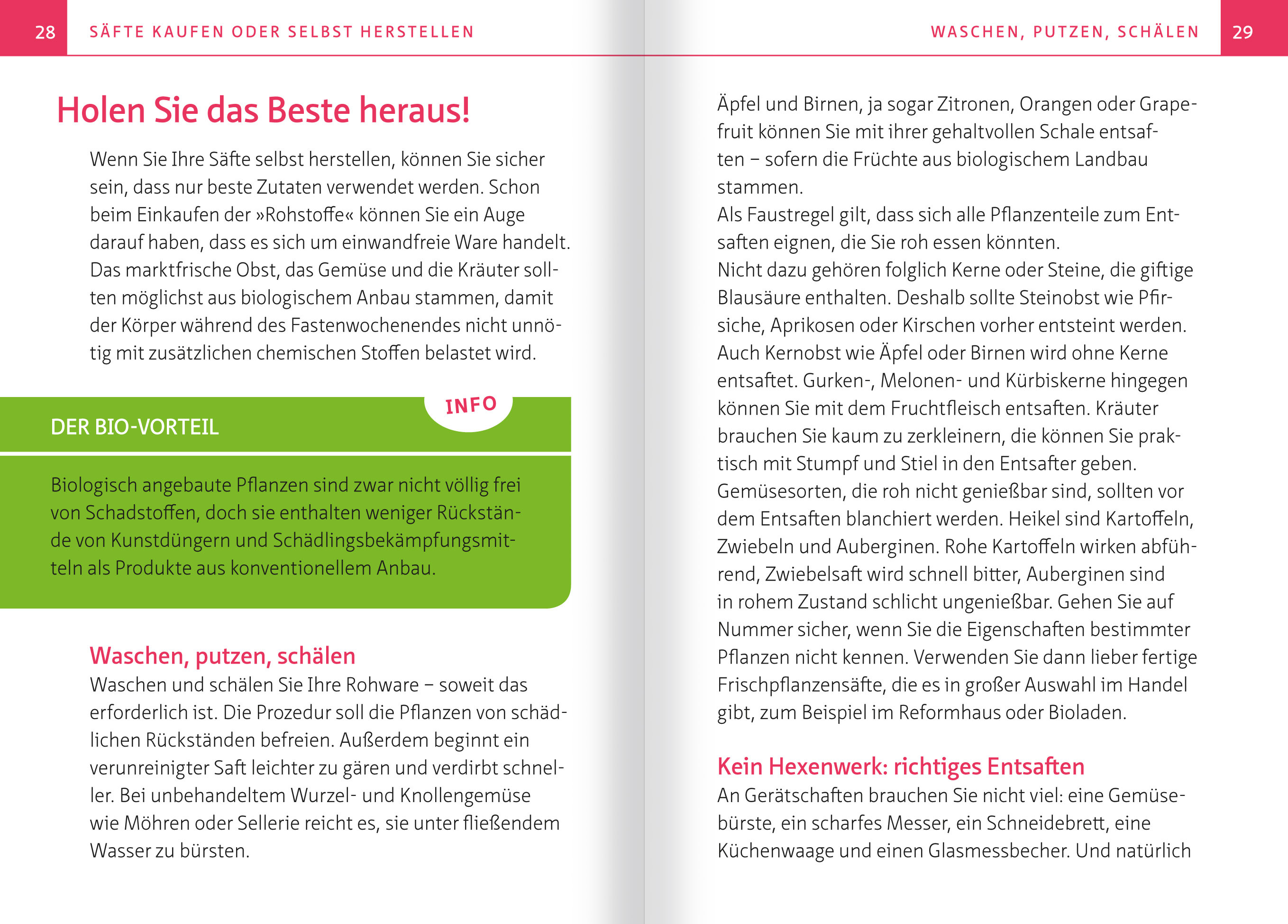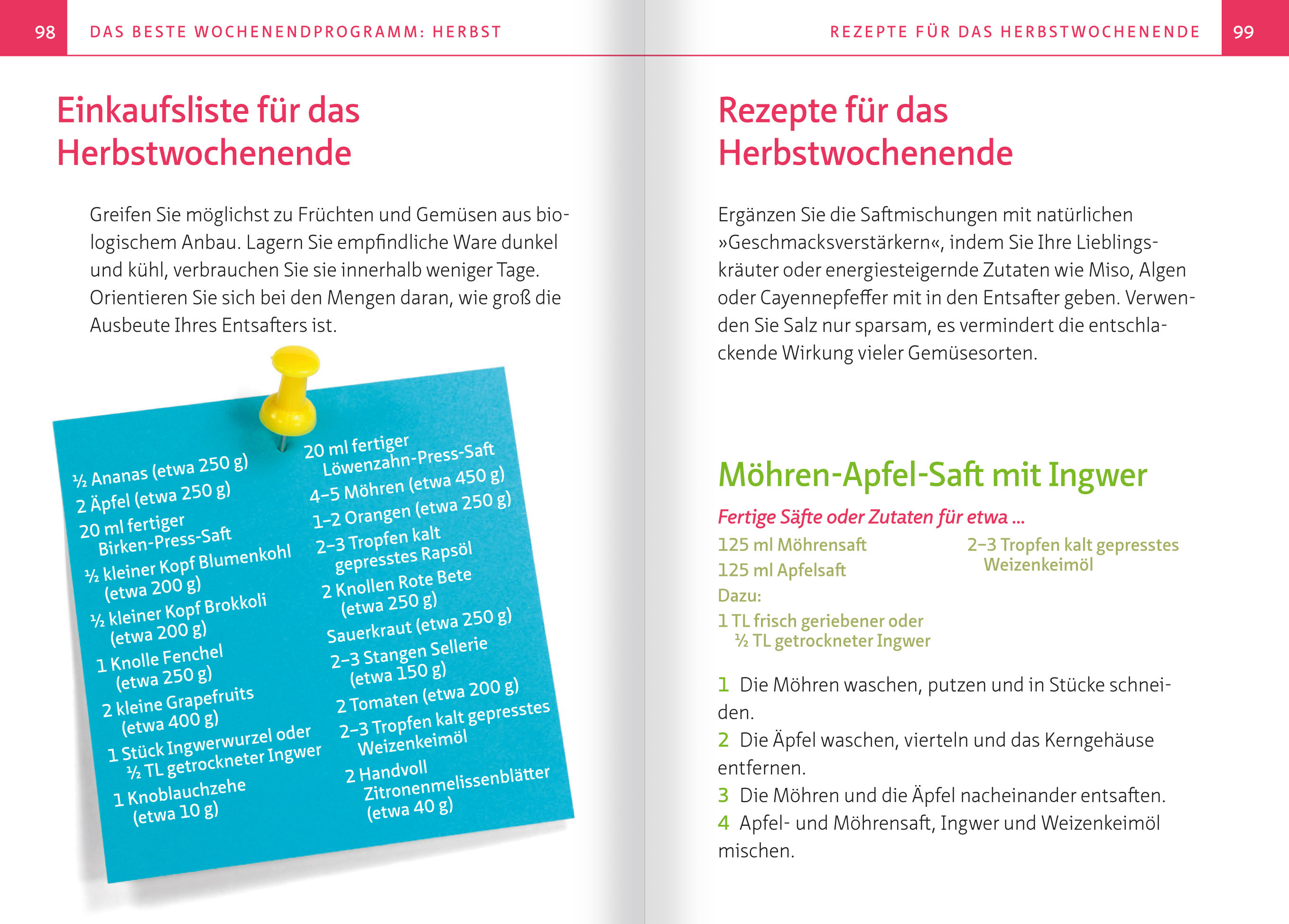 INHALT Vorwort MIT GESUNDEN SÄFTEN GANZ EINFACH ENTGIFTEN Den Stoffwechsel entlasten Saftfastentage sind Entlastungstage Einzigartige Powerstoffe Wichtige Tipps SÄFTE KAUFEN ODER SELBST HERSTELLEN Holen Sie das Beste heraus! EXTRA: Teemischungen zum Entschlacken Was es mit den Smoothies auf sich hat Gesunde Säfte miteinander mischen DIE BESTEN FASTENSÄFTE ÜBERHAUPT Fastensäfte fürs Frühjahr - Batavia-Radieschen-Saft - Blumenkohl-Papaya-Saft - Kohlrabi-Aprikosen-Smoothie - Mango-Kresse-Smoothie - Radicchiosaft - Tomaten-Orangen-Saft - Weintraubensaft EXTRA: Würzkräuter und ihre Wirkung Fastensäfte für den Sommer - Apfel-Heidelbeer-Saft - Beeren-Smoothie - Brokkoli-Möhren-Saft - Gurken-Smoothie - Lollo-Rosso-Erdbeer-Smoothie - Mango-Pfirsich-Saft Fastensäfte für den Herbst - Apfel-Rotkohl-Saft - Birnen-Rauke-Saft - Grapefruit-Kaki-Saft - Melonen-Pflaumen-Saft - Möhrensaft - Sauerkraut-Smoothie - Spitzkohlsaft Fastensäfte für den Winter - Chinakohl-Feigen-Smoothie - Melonensaft - Papaya-Orangen-Smoothie - Orangensaft - Wirsing-Smoothie - Zucchini-Gurken-Saft DAS BESTE WOCHENEND…