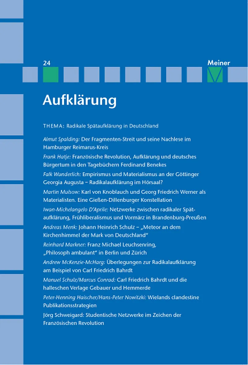 Martin Mulsow, Guido Naschert Einleitung: Radikale Spätaufklärung in Deutschland. Einzelschicksale - Konstellationen - Netzwerke ABHANDLUNGEN Hamburg, Bremen Almut Spalding: Der Fragmenten-Streit und seine Nachlese im Hamburger Reimarus-Kreis Frank Hatje: Jako...
