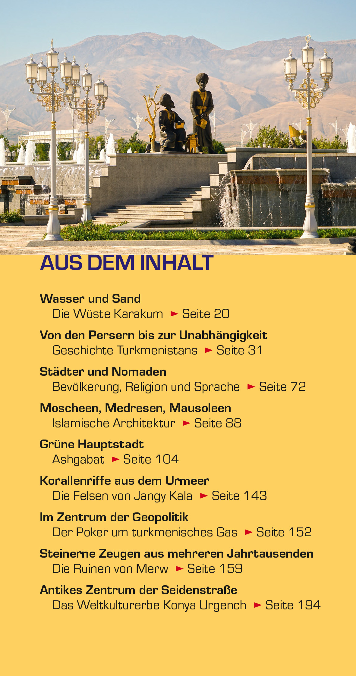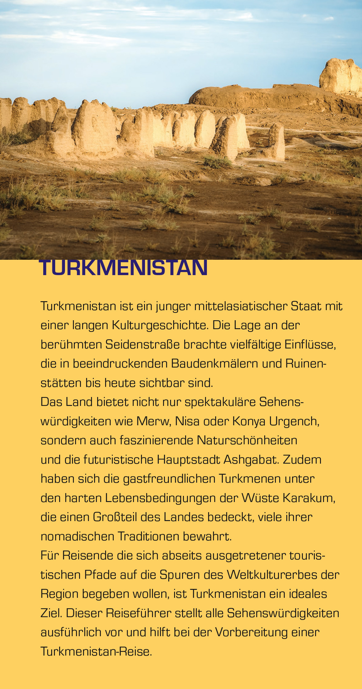 Seite 20VON DEN PERSERN BIS ZUR UNABHÄNGIGKEITGeschichte Turkmenistans > Seite 31STÄDTER UND NOMADENBevölkerung, Religion und Sprache > Seite 72MOSCHEEN, MEDRESEN, MAUSOLEENIslamische Architektur > Seite 88GRÜNE HAUPTSTADTAshgabat > Seite 104KORALLENRIFFE AUS DEM URMEERDie Felsen von Jangy Kala > Seite 143IM ZENTRUM DER GEOPOLITIKDer Poker um turkmenisches Gas > Seite 152STEINERNE ZEUGEN AUS MEHREREN JAHRTAUSENDENDie Ruinen von Merw > Seite 159ANTIKES ZENTRUM DER SEIDENSTRAßEDas Weltkulturerbe Konya Urgench > Seite 194Turkmenistan ist ein junger mittelasiatischer Staat mit einer langen Kulturgeschichte. Die Lage an der berühmten Seidenstraße brachte vielfältige Einflüsse, die in beeindruckenden Baudenkmälern und Ruinenstätten bis heute sichtbar sind. Das Land bietet nicht nur spektakuläre Sehenswürdigkeiten wie Merw, Nisa oder Konya Urgench, sondern auch faszinierende Naturschönheiten und die futuristische Hauptstadt Ashgabat. Zudem haben sich die gastfreundlichen Turkmenen unter den harten Lebensbedingungen der Wüste Karakum, die einen Großteil des Landes bedeckt, viele ihrer nomadischen Traditionen bewahrt.Für Reisende die sich abseits ausgetretener touristischen Pfade auf die Spuren des Weltkulturerbes der Region begeben wollen, ist Turkmenistan ein ideales Ziel. Dieser Reiseführer stellt alle Sehenswürdigkeiten ausführlich vor und hilft bei der Vorbereitung einerTurkmenistan-Reise.>>> Weitere Reiseführer zur Seidenstraße und zu Asien finden Sie auf www.trescher-verlag.de