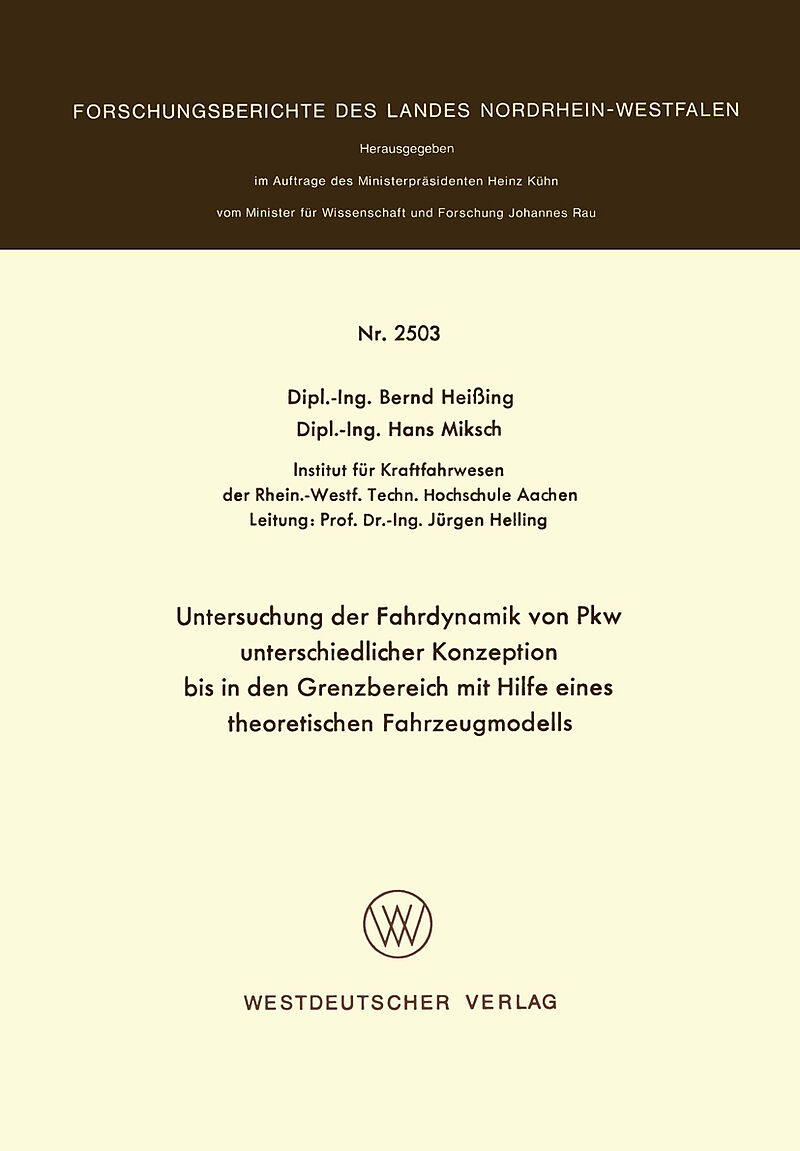 Inhalt 1. Aufgabenstellung.- 2. Stand der Forschung.- 3. Mathematisches Fahrzeugmodell (Kurzbeschreibung des Arbeitsmittels).- 4. Fahrzeugbezogene Meßdaten.- 4.1 Fahrzeuggeometrie.- 4.2 Massen und Massenträgheitsmomente.- 4.3 Kennwerte der Radaufhängung.- 4.4 ...