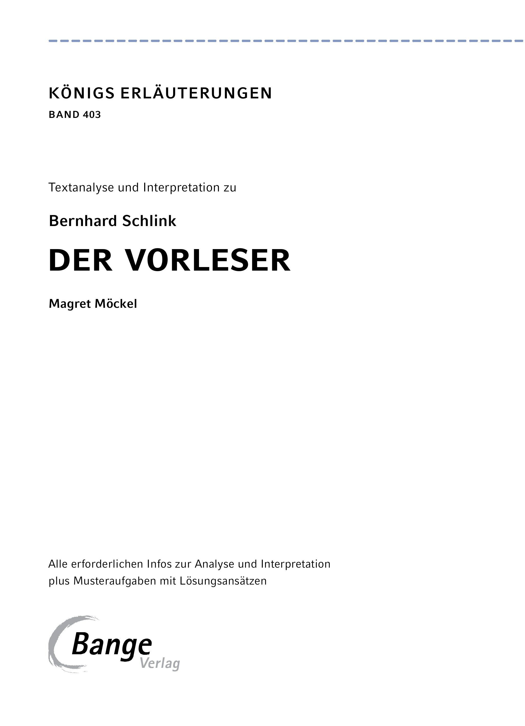 Spare Zeit und verzichte auf lästige Recherche! In diesem Band von Schlink, Der Vorleser findest du alles, was du zur Vorbereitung auf Referat, Klausur, Abitur oder Matura benötigst ohne das Buch komplett gelesen zu haben. Alle wichtigen Infos zur Interpretat...