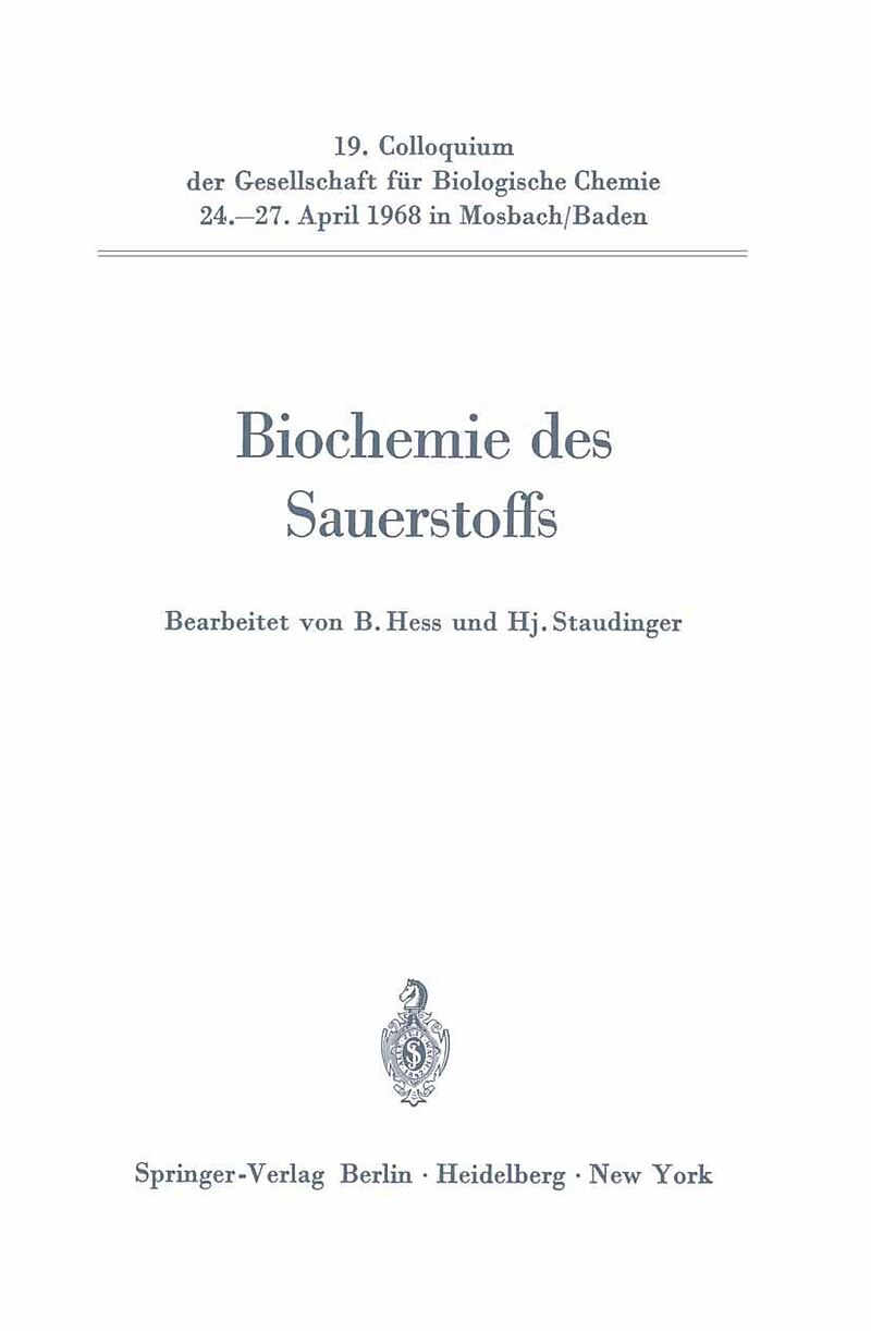 Der vorliegende Band umfaBt die Vortrage und Diskussionen des 19. Mosbacher Colloquiums. Die Unterzeichneten haben die wissenschaftliche Organisation des Colloquiums ubernommen in der Absicht, die wesentlichen Aspekte der Biochemie des Sauer stoffs durch her...
