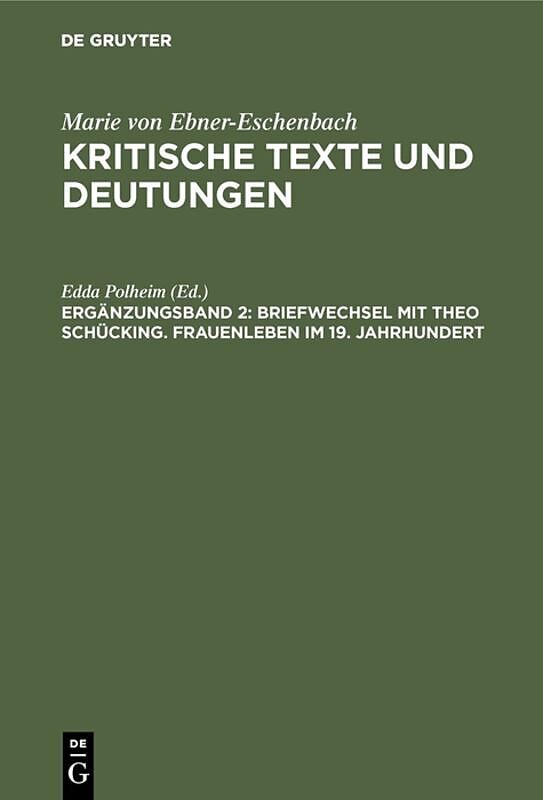This supplementary volume to the critical edition of Ebner-Eschenbach's works contains her correspondence with Theo Schücking (Lewin Schücking's daughter) and also includes other documents: writings by Theo Schücking and selections from her correspondence wit...