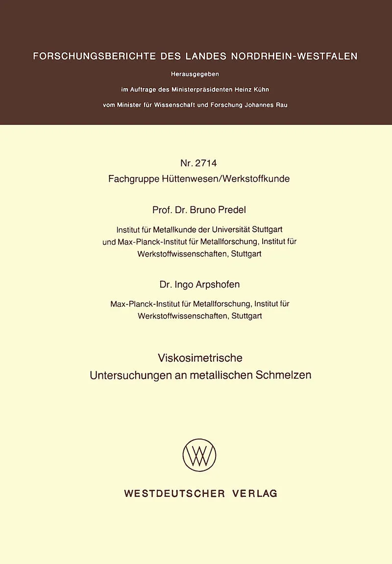 Inhalt 1. Vorbemerkungen.- 1.1 Zur Definition der Viskosität.- 1.2 Die Viskosität als Transportphänomen.- 1.3 Anomalien im Viskositäts-Temperatur-Verlauf.- 2 Meßmethoden.- 2.1 Kapillar-Viskosimeter.- 2.2 Rotations-Viskosimeter (Couette-System).- 2.3 Torsions-O...