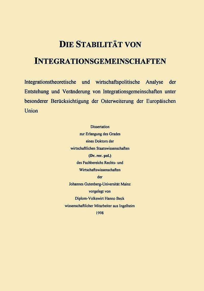 Aus welchem Grund entstehen Integrationsgemeinschaften und unter welchen Bedingungen entwickeln sie sich weiter? Unter Anwendung von Instrumentarien der Spieltheorie und der Neuen Politischen Ökonomie untersucht Hanno Beck die Dynamik von Integrationsprozesse...