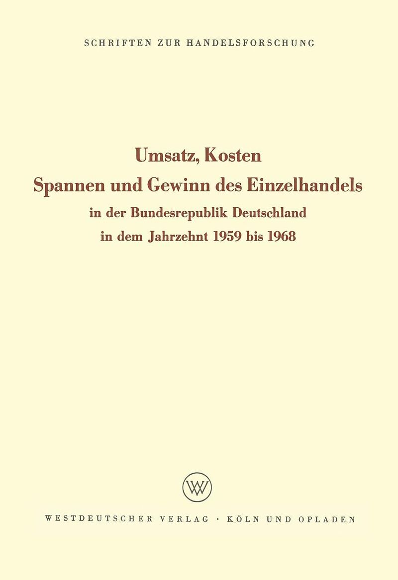 Das Institut hat im Jahre 1962 als Nummer 22 der Schriften zur Handelsforschung unter dem Titel "Umsatz, Kosten, Spannen und Gewinn des Einzelhandels in der Bundesrepublik Deutschland in den Jahren 1949 bis 1958" einen Zehnjahresbericht über den Betriebsver gl...