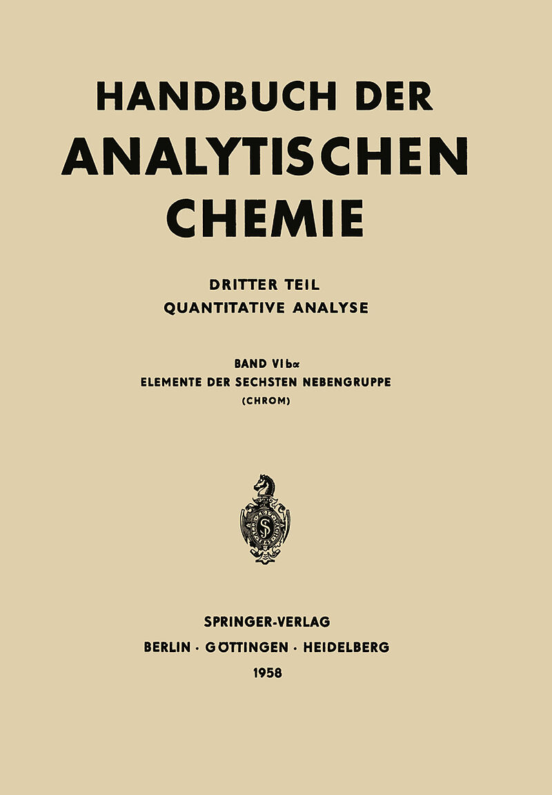 § 1. Gravimetrische Bestimmung des 3wertigen Chroms, insbesondere als Chrom(III)-oxyd.- A. Abscheidung als Oxydhydrat und Bestimmung als Chrom(III)-oxyd.- Allgemeines.- Eigenschaften des Chrom(III)-oxyds.- Das System Cr2O3H2O.- Alterung.- Übergang von Chrom (III)-oxydhydrat in Cr2O3.- Weitere Eigenschaften des Chrom(III)-hydroxyds.- 1. Fällung mit Ammoniak nach Rothaug.- Arbeitsvorschrift.- Bemerkungen.- 2. Fällung mit Ammoniak in Gegenwart von Hydroxylamin nach Jannasch.- Arbeitsvorschrift.- Bemerkungen.- 3. Fällung mit Ammoniumnitrit nach Schirm.- Arbeitsvorschrift.- Bemerkungen.- 4. Fällung mit Pyridin nach Ostroumow.- Arbeitsvorschrift.- Bemerkungen.- 5. Fällung mit Hexamethylentetramin nach Rây.- Arbeitsvorschrift.- Trennungsmöglichkeiten.- 6. Fällung mit Natriumacid und Natriumnitrit nach Hahn.- Fällungslösung.- Arbeitsvorschrift.- Genauigkeit.- 7. Fällung mit ammonbasischen Quecksilbersalzen nach olaja.- Arbeitsvorschrift.- Bemerkungen.- 8. Fällung mit Anilin nach Schöller.- Arbeitsvorschrift.- Bemerkungen.- 9. Fällung mit Kaliumjodid-Jodat nach Stock.- Arbeitsvorschrift.- Bemerkungen.- 10. Fällung mit Kaliumcyanat nach Ripan.- Arbeitsvorschrift.- Trennungsmöglichkeiten.- 11. Fällung mit Natriumthiosulfat und Schwefelwasserstoff nach Krüger.- Arbeitsvorschrift.- Trennungsmöglichkeiten.- B. Abscheidung und Bestimmung als Chromphosphat.- C. Abscheidung durch Elektrolyse an der Quecksilberkathode und Bestimmung als metallisches Chrom.- 1. Verfahren nach Tutundi?.- Apparatur.- Arbeitsvorschrift.- Bemerkungen.- 2. Ältere Abschei dungs verfahren.- I. Nach Myers.- II. Nach Kollock und Smith.- D. Mikrogravimetrische Chrombestimmung.- Literatur.- § 2. Gravimetrische Bestimmung des 6wertigen Chroms durch Abscheidung als schwerlöslichesChromat.- A. Abscheidung und Bestimmung als Chromat.- Allgemeines.- Eigenschaften der Metallchromate.- 1. Bestimmung als Bariumchromat.- I. Verfahren nach Treadwell.- II. Verfahren nach Winkler.- 2. Bestimmung als Silberchromat.- I. Verfahren nach Winkler.- II. Verfahren nach Gooch und Weed.- III. Radiochemisches Verfahren nach Govaerts und Barcia-Goyanes.- 3. Bestimmung als Bleichromat.- Allgemeines.- Verfahren nach Tschawdarov.- Arbeitsvorschrift.- Bemerkungen.- B. Abscheidung als Quecksilber(I)-chromat und Bestimmung als Chromoxyd.- Allgemeines. Eigenschaften des Quecksilber(I)-Chromats.- Verfahren nach Treadwell.- Arbeitsvorschrift.- Bemerkungen.- I. Fällungsmittel.- II. Fällungsbedingungen.- III. Störende Stoffe.- IV. Anwendungsmöglichkeiten.- C. Weitere vorgeschlagene Verfahren.- 1. Fällung als Chrom(III)-chromat und Bestimmung als Cr2O3 nach Faktor.- Arbeitsvorschrift.- Bemerkungen.- 2. Chrombestimmung im Ammoniumchromat.- Literatur.- § 3. Jodometrische Bestimmung des Chroms.- A. Umsetzung mit Kaliumjodid und Rücktitration des Jods.- 1. Allgemeines.- 2. Erforderliche Lösungen.- Natriumthiosulfatlösung.- Stärkelösung.- 3. Bestimmungsverfahren.- Arbeitsvorschrift nach Kolthoff.- Arbeitsvorschrift nach Schulek und Dózsa.- Arbeitsvorschrift nach Vosburgh.- Bemerkungen.- B. Bestimmung nach dem Destillationsverfahren.- 1. Allgemeines.- 2. Verfahren nach Jander und Beste.- Apparatur.- Arbeitsvorschrift.- Bemerkungen.- C. Anwendung der jodometrischen Bestimmungsmethode.- 1. Bestimmung von Chrom neben Eisen.- I. Verfahren nach Little und Costa.- II. Verfahren nach Barnebey.- 2. Bestimmung von Chrom neben Kupfer(II)-, Eisen(III)-, Molybdän(VI)-, Vanadium(V)- und Cer(IV)-ionen.- Maskierung der Fremdmetalle durch Komplexon.- Arbeitsvorschrift.- Bemerkungen.- 3.Bestimmung von Chrom neben Mangan nach van derMeulen.- Arbeitsvorschrift.- Bemerkungen.- 4. Bestimmung von Chrom neben Vanadium nach Edgar.- Allgemeines.- Arbeitsvorschrift.- Bemerkungen.- Arbeitsvorschrift.- Genauigkeit.- 5. Bestimmung von Chrom in Legierungen, Stählen und Erzen.- I. In Ferrochrom.- II. In Vanadium- und Molybdänstählen nach Erhard.- III. In Stahl und Eisen.- IV. Weitere Verfahren.- V. In Erzen.- 6. Bestimmung von Chrom neben oxydierenden Stoffen.- I. Neben Chlorsäure und Salpetersäure nach Gröger.- II. Neben Permanganat nach Gélébart.- 7. Bestimmung von Chromat neben Dichromat.- 8. Bestimmung von Chrom in Gegenwart von Gelatine und Eiweißkörpern.- Allgemeines.- Verfahren nach Feigl.- 9. Bestimmung von Chromsäure neben Chrom(III)-Verbindungen.- Betriebskontrolle der Chrombäder.- Arbeitsvorschrift nach Wogrinz.- Berechnung.- Bemerkung.- 10. Chrombestimmung im Chromoxyd.- I. Verfahren nach Field.- II. Verfahren nach Gröger.- 11. Bestimmung der Chromsäure im Bleichromat nach Gröger.- Prinzip.- Arbeitsvorschrift.- Bemerkungen.- D. Weitere jodometrische Bestimmungsverfahren.- 1. Verfahren nach Terni und Malaguti.- Prinzip.- Arbeitsvorschrift.- Bemerkung.- 2. Verfahren nach Müller und Messe.- Prinzip.- Arbeitsvorschrift.- Bemerkungen.- Literatur.- § 4. Bestimmung mit Eisen(II) und Rücktitration.- Allgemeines.- A. Rücktitration mit Kaliumpermanganat.- 1. Allgemeines.- 2. Anwendungen, insbesondere für die Stahl- und Eisenanalyse wie auch für Ferrochrom.- B. Rücktitration mit Kaliumdichromat.- Allgemeines.- C. Rücktitration mit Cer(IV)-sulfat.- Allgemeines.- Literatur.- § 5. Direkte Bestimmung mit Eisen(II)-sulfat.- Allgemeines.- A. Anwendung von Redoxindicatoren.- Allgemeines.- B. Elektrometrische Endpunktanzeige.- Allgemeines.- C.Tüpfelverfahren mit Kaliumhexacyanoferrat(III).- Allgemeines.- Indicatorlösung.- Einstellung der Eisen(II)-sulfatlösung.- Arbeitsvorschrift nach Specht.- Arbeitsvorschrift nach Nydegger.- D. Anwendungen zur direkten Bestimmung mit Eisen(II)-sulfat.- Allgemeines.- Literatur.- § 6. Bestimmung mit arseniger Säure.- Allgemeines.- Herstellung der Maßlösung.- A. Maßanalytische Verfahren mit Rücktitration des Überschusses an arseniger Säure.- Allgemeines.- 1. Reduktion mit arseniger Säure in saurer Lösung.- 2. Reduktion mit arseniger Säure in alkalischer Lösung.- B. Direkte maßanalytische Bestimmung unter