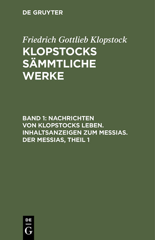 Dieser Titel, "Nachrichten von Klopstocks Leben. Inhaltsanzeigen zum Messias. Der Messias, Theil 1", ist eine wissenschaftliche Publikation, erschienen bei De Gruyter Brill. Ausführliche Beschreibung, Inhaltsverzeichnis und weitere Angaben finden Sie auf der V...