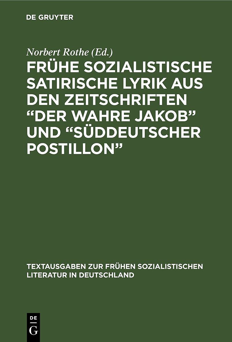 Dieser Titel, "Frühe sozialistische satirische Lyrik aus den Zeitschriften Der wahre Jakob und Süddeutscher Postillon", ist eine wissenschaftliche Publikation, erschienen bei De Gruyter Brill. Ausführliche Beschreibung, Inhaltsverzeichnis und weitere Angaben f...