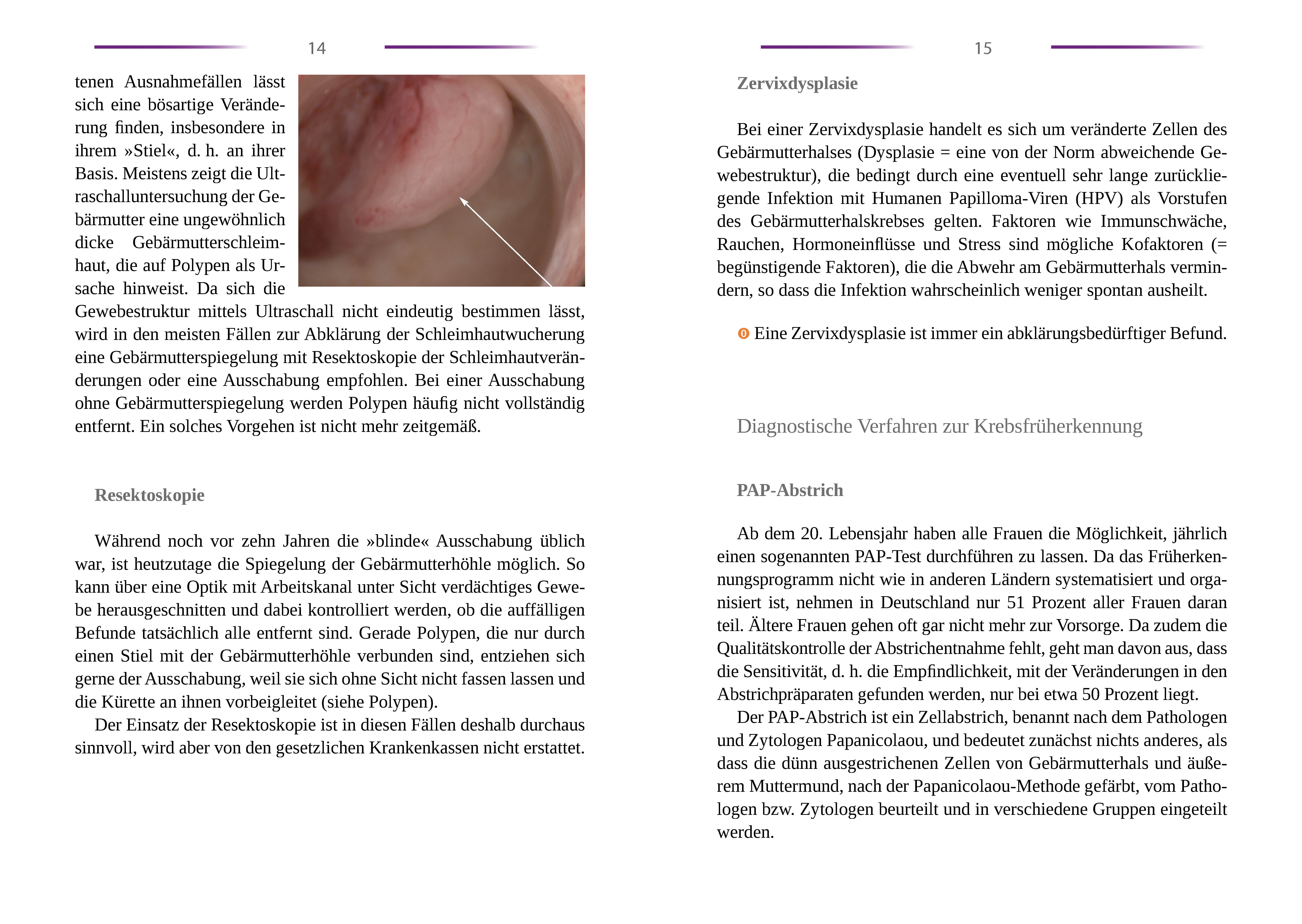 Gutartige und bösartige Veränderungen der Gebärmutterschleimhaut Die Gebärmutter wird unterteilt in den aus Muskulatur bestehenden Gebärmutterkörper und den Gebärmutterhals, der in die Scheide hineinragt. In beiden Bereichen können sich gut- und bösartige Zellveränderungen entwickeln. Sie gehen im Allgemeinen von der Gebärmutterschleimhaut oder der Schleimhaut des Gebärmutterhalses aus. Am Gebärmutterhals befinden sich der äußere Muttermund (Portio) und der Gebärmutterhalskanal (Zervikalkanal). Beide haben unterschiedliche Zellauskleidungen. Auf dem Muttermund bildet sich ein sogenanntes Plattenepithel und im Zervikalkanal ein schleimbildendes Drüsenepithel. Die beiden verschiedenen Zellauskleidungen stoßen aneinander, und zwar abhängig vom Alter der Frau: • während der geschlechtsreifen Jahre sichtbar auf der Portiooberfläche • während der Kindheit und im Alter im Zervikalkanal. An dieser Grenzzone finden Zellumbauvorgänge statt, die bei einer anhaltenden, nicht spontan ausheilenden Virusinfektion mit HP-Viren zum Krebs entarten können. Polypen: Diagnose und Behandlung Bei einer unkontrollierten Wucherung der Gebärmutterschleimhaut können sich Polypen bilden (s. Abb.), die gerade bei älteren Frauen relativ häufig sind. Polypen sind in der Regel gutartig, und nur in seltenen Ausnahmefällen lässt sich eine bösartige Veränderung finden, insbesondere in ihrem »Stiel«, d.h. an ihrer Basis. Meistens zeigt die Ultraschalluntersuchung der Gebärmutter eine ungewöhnlich dicke Gebärmutterschleimhaut, die auf Polypen als Ursache hinweist. Da sich die Gewebestruktur mittels Ultraschall nicht eindeutig bestimmen lässt, wird in den meisten Fällen zur Abklärung der Schleimhautwucherung eine Gebärmutterspiegelung mit Resektoskopie der Schleimhautveränderungen oder eine Ausschabung empfohlen. Bei einer Ausschabung ohne Gebärmutterspiegelung werden Polypen häufig nicht vollständig entfernt. Ein solches Vorgehen ist nicht mehr zeitgemäß. • Resektoskopie Während noch vor zehn Jahren die »blinde« Ausschabung üblich war, ist heutzutage die Spiegelung der Gebärmutterhöhle möglich. So kann über eine Optik mit Arbeitskanal unter Sicht verdächtiges Gewebe herausgeschnitten und dabei kontrolliert werden, ob die auffälligen Befunde tatsächlich alle entfernt sind. Gerade Polypen, die nur durch einen Stiel mit der Gebärmutterhöhle verbunden sind, entziehen sich gerne der Ausschabung, weil sie sich ohne Sicht nicht fassen lassen und die Kürette an ihnen vorbeigleitet (siehe Polypen). Der Einsatz der Resektoskopie ist in diesen Fällen deshalb durchaus sinnvoll, wird aber von den gesetzlichen Krankenkassen nicht erstattet. Zervixdysplasie Bei einer Zervixdysplasie handelt es sich um veränderte Zellen des Gebärmutterhalses (Dysplasie = eine von der Norm abweichende Gewebestruktur), die bedingt durch eine eventuell sehr lange zurückliegende Infektion mit Humanen Papilloma-Viren (HPV) als Vorstufen des Gebärmutterhalskrebses gelten. Faktoren wie Immunschwäche, Rauchen, Hormoneinflüsse und Stress sind mögliche Kofaktoren (= begünstigende Faktoren), die die Abwehr am Gebärmutterhals vermindern, so dass die Infektion wahrscheinlich weniger spontan ausheilt. Eine Zervixdysplasie ist immer ein abklärungsbedürftiger Befund.