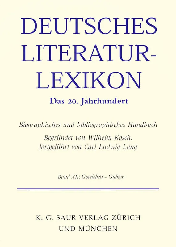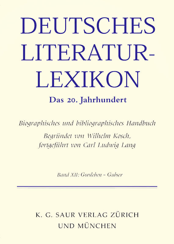 The Deutsches Literatur-Lexikon. Das 20. Jahrhundert comprises German-language writers of particular significance for 20th century literature. Volume 12 includes articles on Gustav Arthur Gräser, Oskar Maria Graf, Günter Grass, Fritz Gross, Mimi Grossberg, Ge...