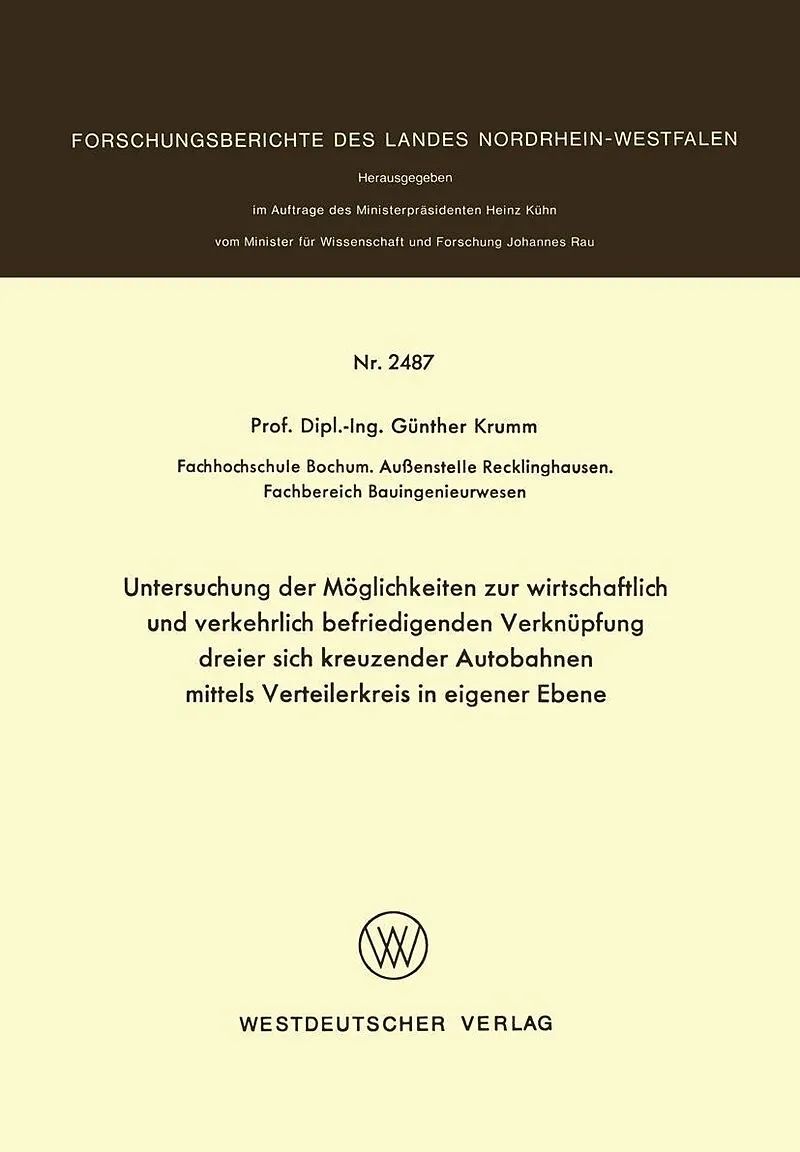 Inhalt 0 Allgemeine Erläuterungen zu dieser Forschungsarbeit.- 1 Möglichkeiten der Verknüpfung dreier Autobahnen.- 2 Lösung der Dreifachverknüpfung durch Verteilerkreise.- 2.1 Bisherige Entwicklung der Verteilerkreise.- 2.2 Zeitgemäße Betrachtungsweise unter s...