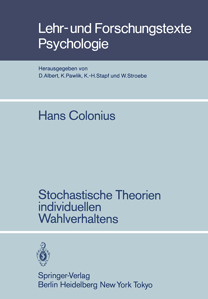 Inhalt § 1 Die experimentellen Paradigmen und ihre formale Struktur.- 1.1 Das Auswahl-Paradigma.- 1.2 Das Paradigma des Rangordnens.- 1.3 Das Ausschluß-Paradigma.- 1.4 Das Paarvergleichsparadigma.- § 2 Stochastische Modelle des Wahlverhaltens: Überblick.- 2.1 ...