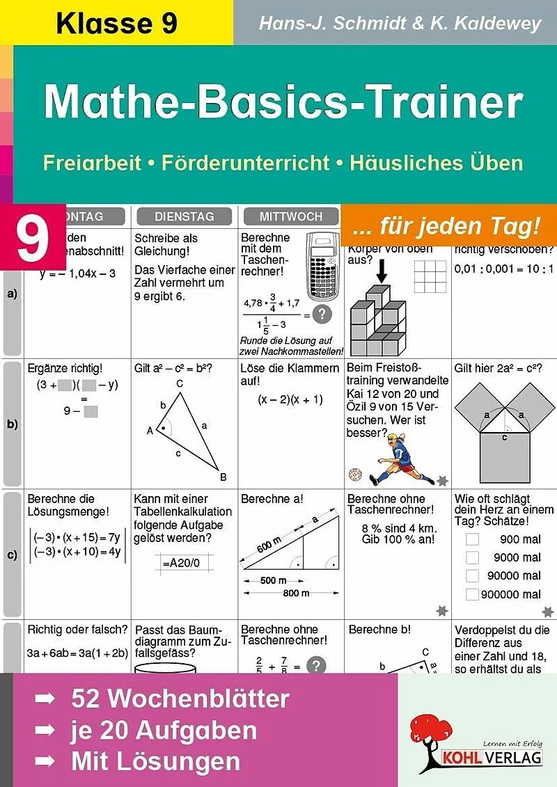 Unser Arbeitsheft für Mathematik in der Sekundarstufe Klasse 9 bietet eine vielfältige Sammlung von Aufgaben, die speziell darauf ausgerichtet sind, Grundkompetenzen wie Bruchrechnung, Prozentrechnung, Geometrie, lineare Funktionen, Potenzen und den Satz des P...