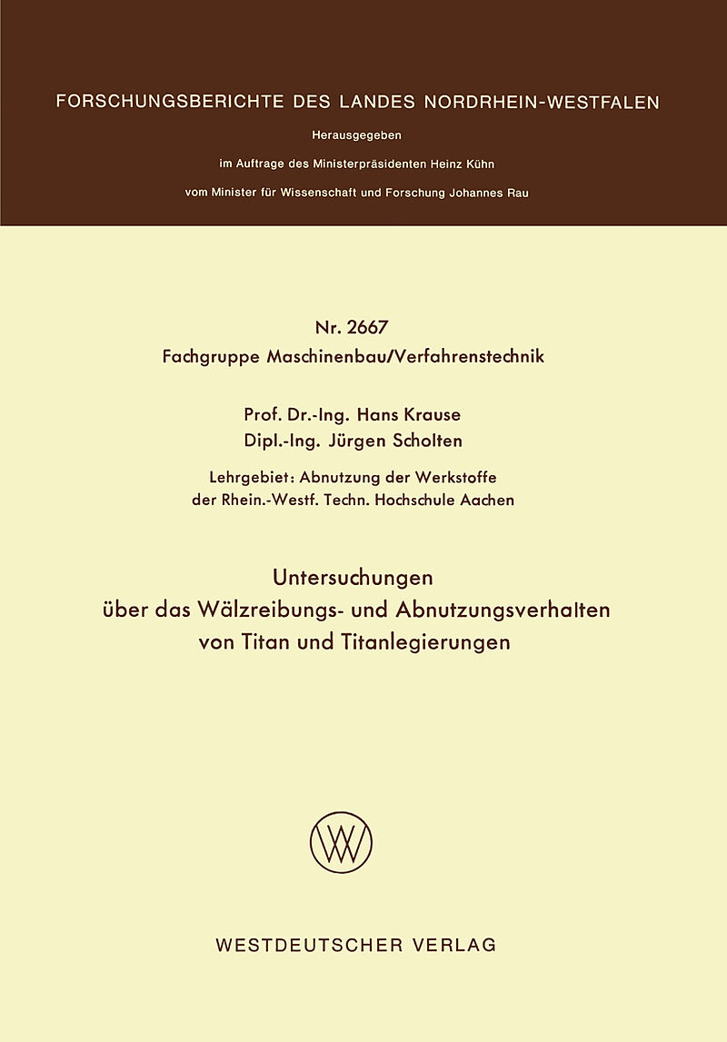 Inhalt 1. Einleitung, Stand der Kenntnisse.- 2. Vorteile und Nachteile beim Einsatz von Titanwerkstoffen.- 3. Allgemeines zur Verschleißtechnik.- 4. Beschreibung der Modellversuche.- 5. Vorgänge in der Grenzschicht bei Wälzbeanspruchung.- 6. Versuchsergebnisse...