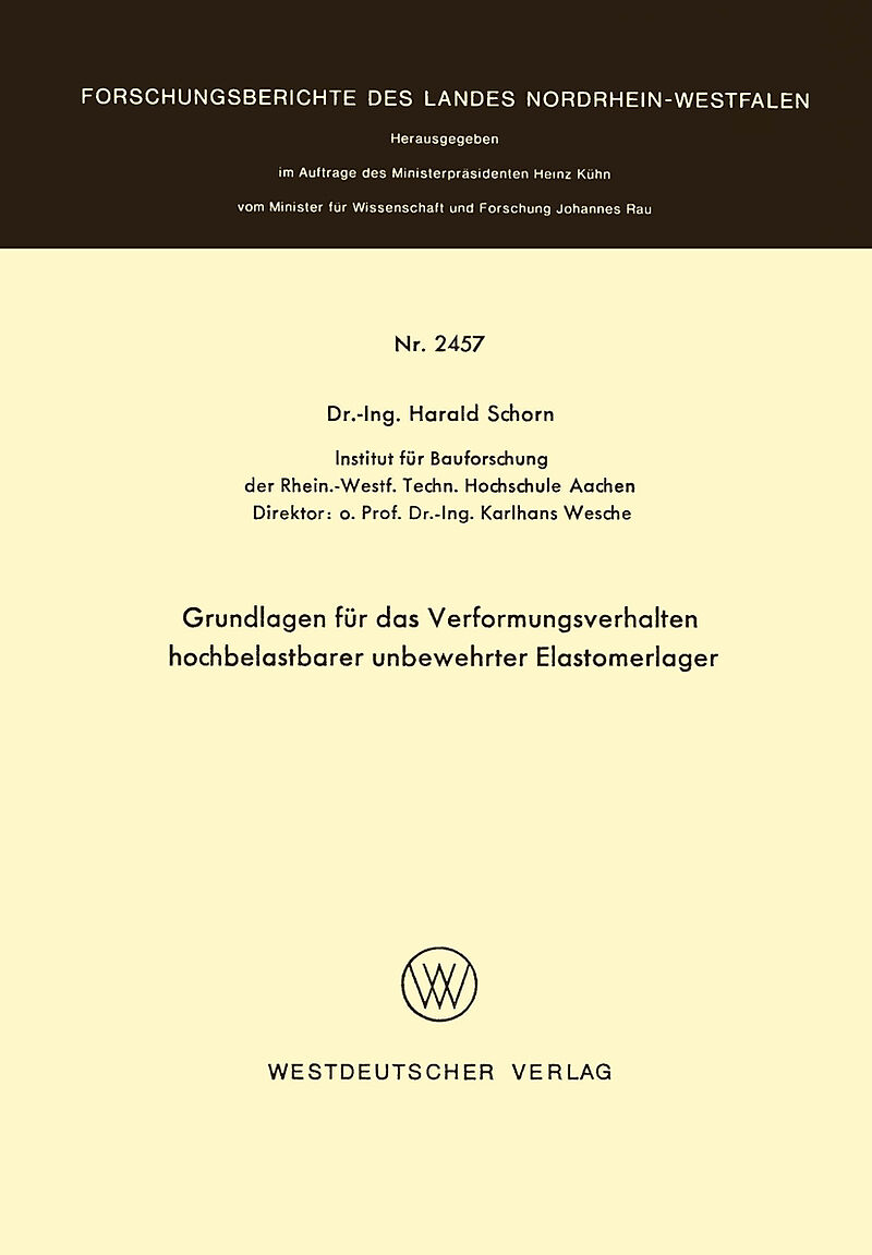 Inhalt 1. Einleitung.- 2. Übersicht über das Forschungsgebiet Elastomerlager.- 3. Der elastomere Werkstoff.- 3.1. Allgemeine Grundsätze.- 3.2. Physikalisch-mechanische Eigenschaften von der Lagerfunktion.- 3.3. Lagerbauarten.- 3.4. Phänomenologische Betrachtun...