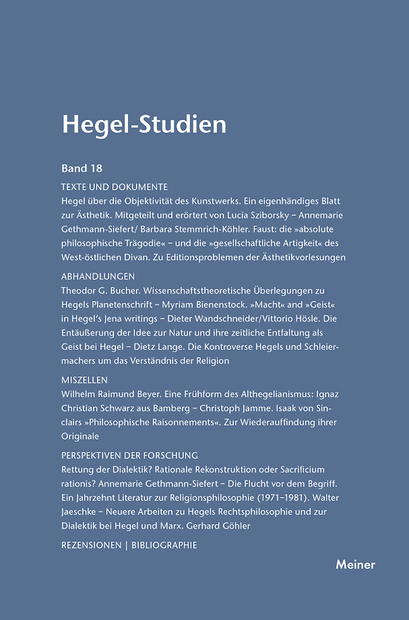 TEXTE UND DOKUMENTE Hegel über die Objektivität des Kunstwerks. Ein eigenhändiges Blatt zur Ästhetik. Mitgeteilt und erörtert von Lucia Sziborsky Annemarie Gethmann-Siefert/ Barbara Stemmrich-Köhler. Faust: die "absolute philosophische Trägodie" und die "gesel...