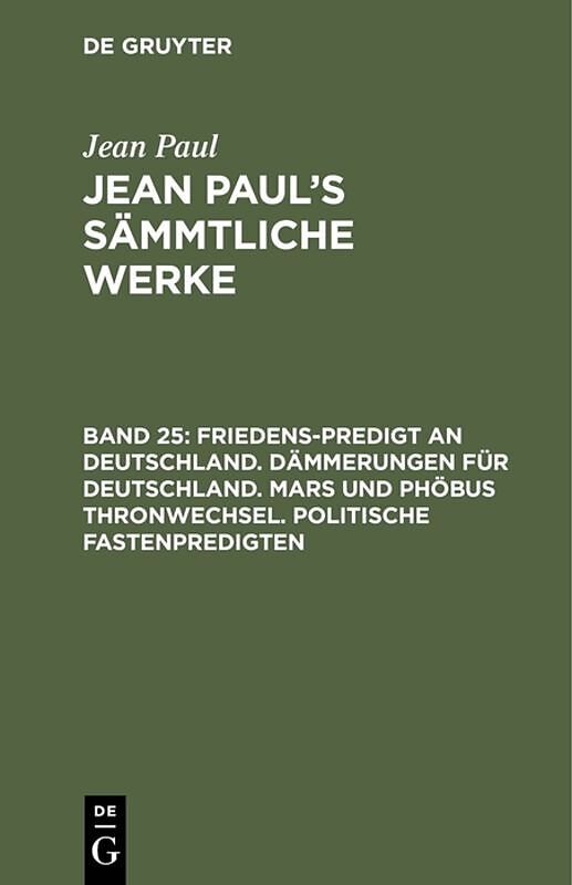 Keine ausführliche Beschreibung für "Friedens-Predigt an Deutschland. Dämmerungen für Deutschland. Mars und Phöbus Thronwechsel. Politische Fastenpredigten" verfügbar. Zusammenfassung Frontmatter -- Inhalt des fünf und zwanzigsten Bandes -- Friedenspredigt an...