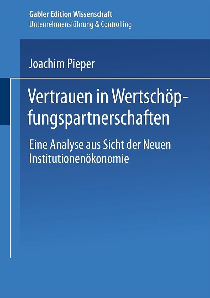 Das Thema Vertrauen ist zu einem wichtigen Untersuchungsgegenstand der Betriebswirtschaftslehre geworden. Doch trotz dieses hohen wissenschaftlichen Interesses besteht großer Forschungsbedarf. Joachim Pieper untersucht die wirtschaftliche Zweckmäßigkeit von V...