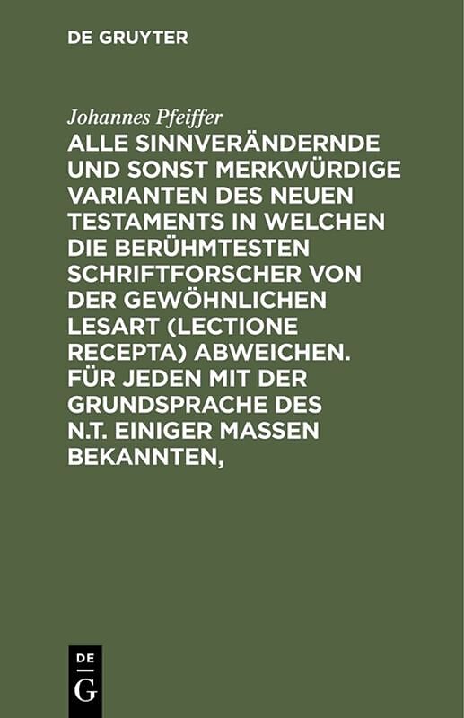Dieser Titel, "Alle sinnverändernde und sonst merkwürdige Varianten des Neuen Testaments in welchen die berühmtesten Schriftforscher von der Gewöhnlichen Lesart (lectione recepta) abweichen. Für jeden mit der Grundsprache des N.T. einiger Maßen Bekannten,", is...