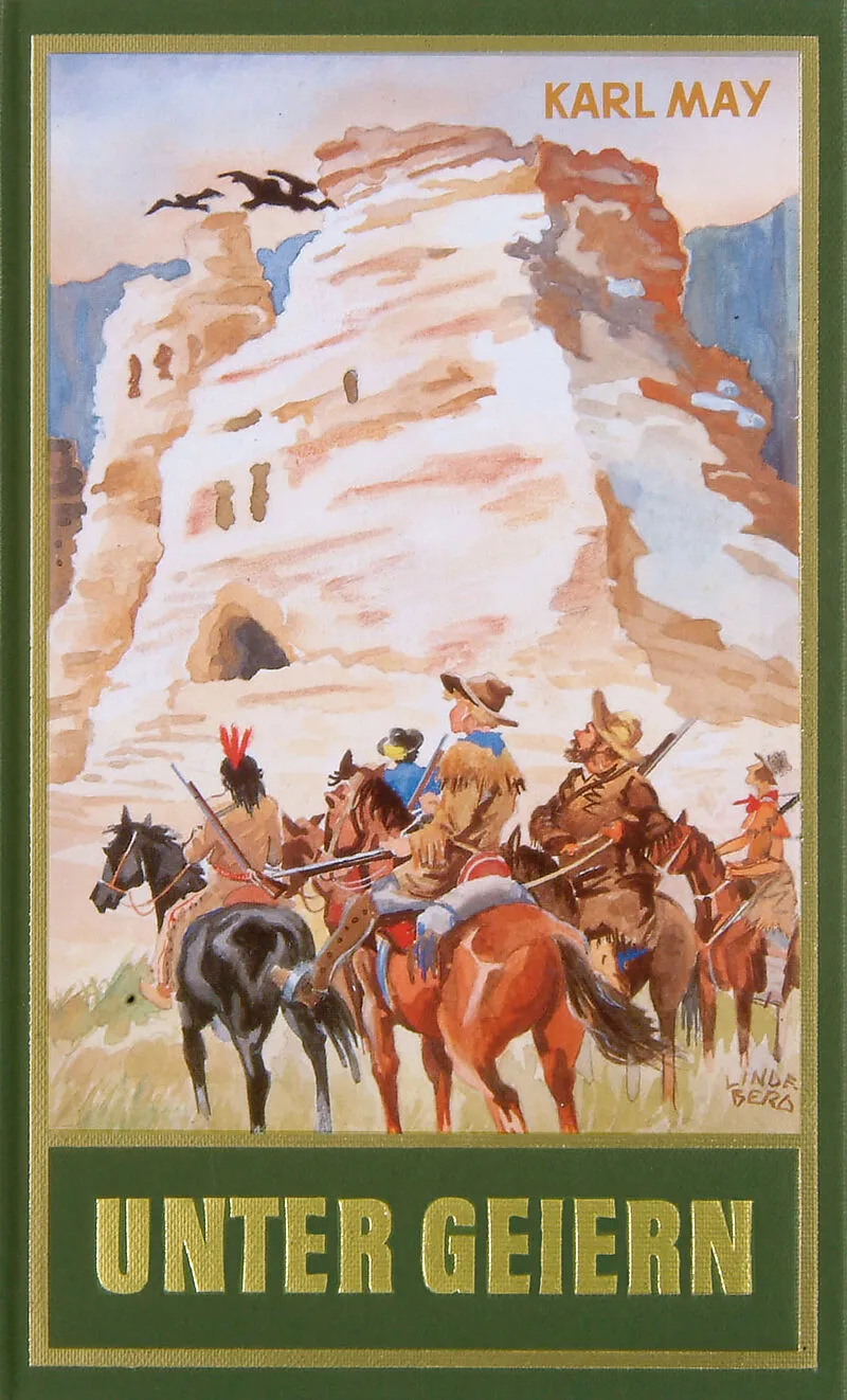 Unter Geiern spielen zwei fesselnde Wildwest-Erzählungen: unter den "Felsengeiern" der Rocky Mountains (Der Sohn des Bärenjägers) und unter den "Wüstengeiern" der "Staked Plains" (Der Geist des Llano Estacado). Es gibt ein Wiedersehen mit Winnetou, Old Shatter...