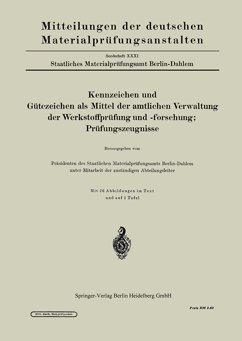 Kennzeichen und Gütezeichen als Mittel der amtlichen Verwaltung der Werkstoffprüfung und -forschung; Prüfungszeugnisse