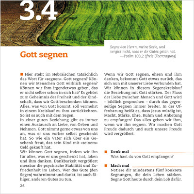 Segen entdecken Tipps zur Anwendung Woche 1: Was Segen ist 1.1 Was ist Segen? 1.2 So sieht Segen aus 1.3 Der erste Segen 1.4 Gott segnet Abraham + Isaak 1.5 Auswirkungen des Segens 1.6 Was ist Fluch? 1.7 Segen und Fluch als Wahl Woche 2: Segen konkret 2.1 Was wird alles gesegnet? 2.2 Segen ganz praktisch 2.3 Jakobs Kampf um den Segen 2.4 Segen in Generationen 2.5 Segen in Generationen II 2.6 Wie komme ich zu Segen? 2.7 Wie komme ich zu Segen? II Woche 3: Menschen segnen 3.1 Segen priesterlicher Dienst 3.2 Wir segnen mit Gott 3.3 Segenszeichen 3.4 Gott segnen 3.5 Auf die Worte achten 3.6 Die Macht der Worte 3.7 Gute und schlechte Gedanken Woche 4: Spezifischer Segen 4.1 Mein Land 4.2 Familie, Ehe 4.3 Politik 4.4 Kranke 4.5 Dinge 4.6 Feinde 4.7 Ein Segen sein Was mir wichtig wurde