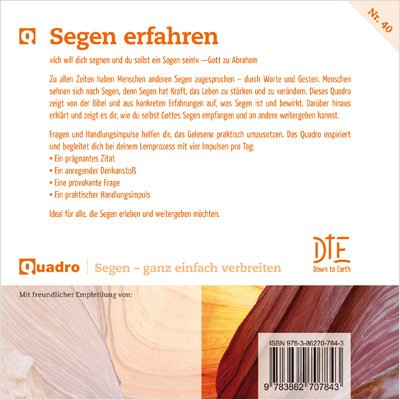 »Ich will dich segnen und du sollst ein Segen sein!« Gott zu Abraham Zu allen Zeiten haben Menschen anderen Segen zugesprochen durch Worte und Gesten. Menschen sehnen sich nach Segen, denn Segen hat Kraft, das Leben zu stärken und zu verändern. Dieses Quadro z...»Ich will dich segnen und du sollst ein Segen sein!« Gott zu Abraham Zu allen Zeiten haben Menschen anderen Segen zugesprochen durch Worte und Gesten. Menschen sehnen sich nach Segen, denn Segen hat Kraft, das Leben zu stärken und zu verändern. Dieses Quadro zeigt von der Bibel und aus konkreten Erfahrungen auf, was Segen ist und bewirkt. Darüber hinaus erklärt und zeigt es dir, wie du selbst Gottes Segen empfangen und an andere weitergeben kannst. Fragen und Handlungsimpulse helfen dir, das Gelesene praktisch umzusetzen. Das Quadro inspiriert und begleitet dich bei deinem Lernprozess mit vier Impulsen pro Tag: ein prägnantes Zitat, ein anregender Denkanstoß, eine provokante Frage, ein praktischer Handlungsimpuls. Ideal für alle, die Segen erleben und weitergeben möchten.