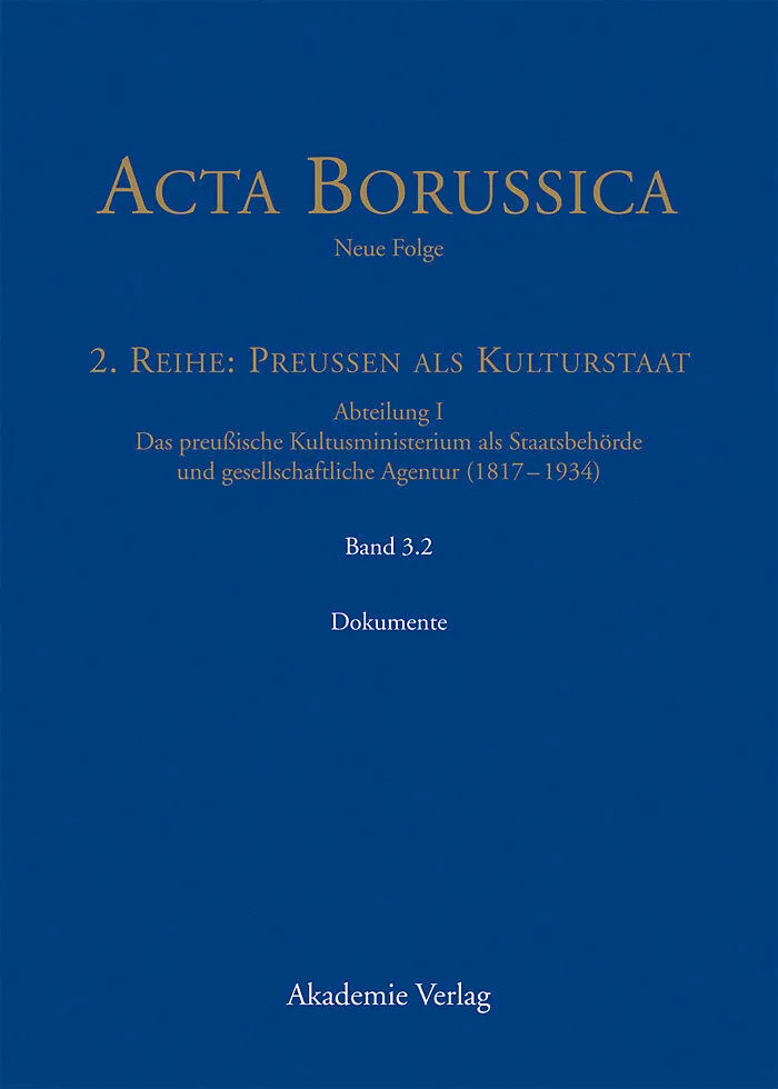 Mit Preußen als Kulturstaat setzt die Berlin-Brandenburgische Akademie der Wissenschaften die Neue Folge der einst von Gustav Schmoller begründeten Acta Borussica fort. Die auf mehr als zehn Bände projektierte zweite Reihe rückt dabei mit der Kulturstaatsproblematik einen zentralen, bisher von der Geschichtswissenschaft vernachlässigten Aspekt der preußischen Geschichte in den Mittelpunkt des Forschungsinteresses. In einer Kombination von mehrbändigen Auswahleditionen und thematischen Forschungsmonographien wird das Verhältnis von Staatsbildung, Kultur und Gesellschaft im 19. und frühen 20. Jahrhundert dokumentiert und analysiert. Dieser Editionsband schließt ebenfalls an die bereits erschienenen Titel zum Kultusministerium an. Er enthält zu den im Band 3.1 untersuchten Fallbeispielen insgesamt 136 Dokumente, mit denen die Wechselwirkung von gesellschaftlichen Initiativen und Nachfragen und Handeln des preußischen Kultusministeriums in den unterschiedlichen Bereichen der preußischen Kulturpolitik erkennbar wird und Impulsgebung, Kommunikationswege und Entscheidungsabläufe rekonstruiert werden können. Stets in Rückkopplung auf das Kultusministerium dokumentieren die ausgewählten, bislang ungedruckten Archivalien beispielsweise das frühe Wirken von Personen und Vereinen für die Entfaltung eines öffentlichen Kunstlebens auch fern von Preußens Hauptstadt sowie das Engagement von außerkirchlichen Vereinen als bislang kaum beachtet Frühform des bürgerlichen Vereinswesens. Schlüsseldokumente aus den ersten Jahren der Demagogenverfolgungen belegen, wie der Versuch abgewehrt werden konnte, das Ministerium für das Innenressort zu instrumentalisieren. Ausgewählte Quellenstücke zur Katholischen Abteilung im Kultusministerium beleuchten die wechselvolle Geschichte ihrer Entstehung, Tätigkeit und Auflösung. Der politisch stets relevante Bildungsbereich wird im Band mit erstmals gedruckten Quellen zu volkstümlichen Hochschulkursen, zu den Debatten um staatsbürgerliche Bildung und Erziehung sowie zu den Schulversuchen zur Einführung der Sütterlin-Schrift bzw. des Schulfunks vielfältig dokumentiert, während die edierten Schriftstücke zur 1901 gegründeten Königlichen Versuchs- und Prüfungsanstalt für Wasserversorgung und Abwässerbeseitigung besonders das Ineinandergreifen von Staat, Kommunen und (Industrie-)Verbänden offen legen. Die Dokumente stammen nicht nur aus der archivalischen Überlieferung des Kultusministeriums, sondern ebenso aus anderen preußischen Ministerien, aus dem Zivilkabinett des Monarchen, dem Brandenburgischen-Preußíschen Hausarchiv und dem Historischen Archiv des Erzbistums Köln. Darstellung und Edition sind aufeinander abgestimmt und durch gegenseitige Verweise miteinander vernetzt.