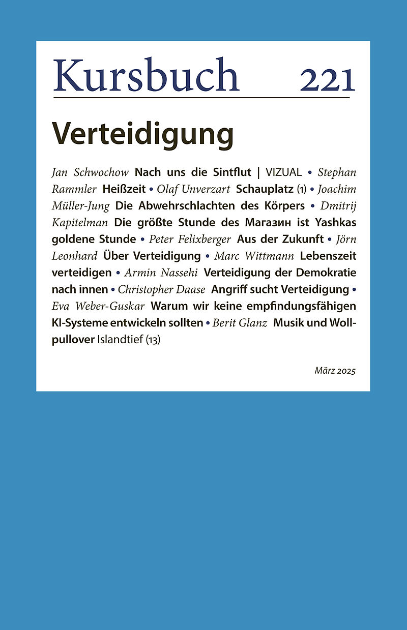 Das Kursbuch 221 über Verteidigung nimmt vieles in Angriff. Zunächst die militärische Verteidigung. Kriegsminister gibt es nicht mehr. Christopher Daase analysiert die differenzierte Verschränkung von Angriff und Verteidigung, Jörn Leonhard liefert eine histor...