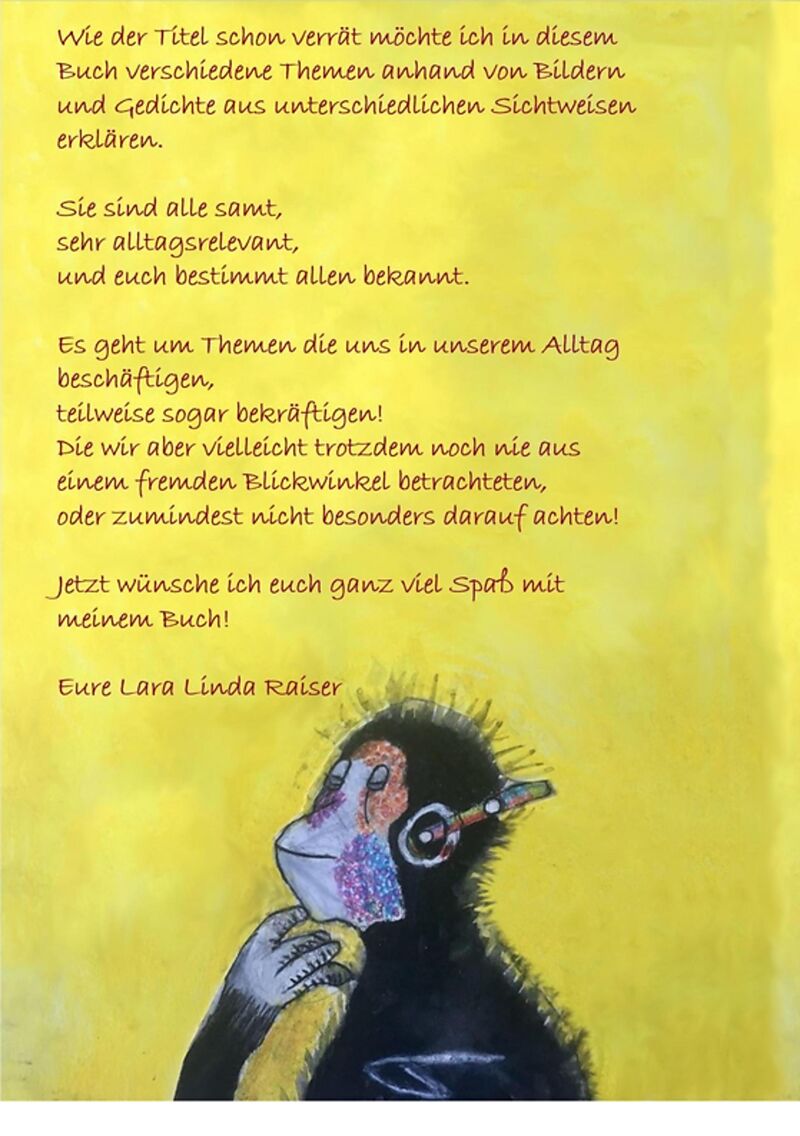 Wie der Titel schon verrät, möchte ich in diesem Buch verschiedene Themen anhand von Bildern und Gedichte aus unterschiedlichen Sichtweisen erklären. Sie sind alle samt, sehr alltagsrelevant, und euch bestimmt allen bekannt. Es geht um Themen, die uns in unse...