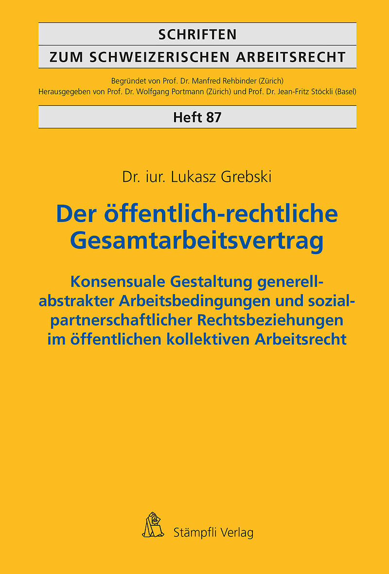 Das vorliegende Werk befasst sich mit den rechtlichen Aspekten des öffentlich-rechtlichen Gesamtarbeitsvertrags, folglich mit der konsensualen Gestaltung generell-abstrakter Arbeitsbedingungen und sozialpartnerschaftlicher Rechtsbeziehungen im öffentlichen kol...