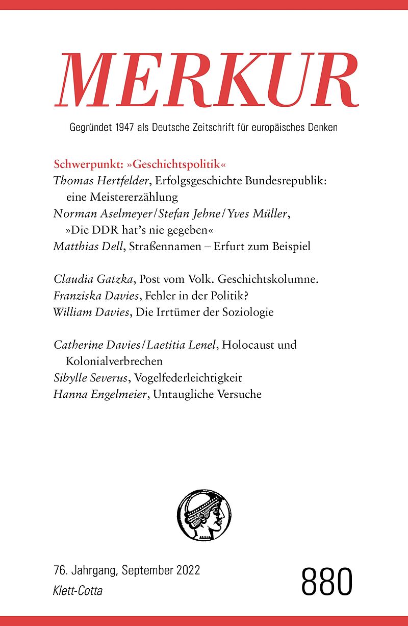 Das Septemberheft hat einen Schwerpunkt zum Thema "Geschichtspolitik". Thomas Hertfelder unterzieht dabei die Meistererzählung von der Bundesrepublik als sich bewährender, reüssierender Demokratie einer kritischen Analyse. Vor allem auf eine Leerstelle in den ...