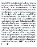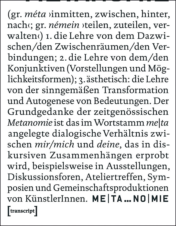 (gr. méta inmitten, zwischen, hinter nach; gr. némein teilen, zuteilen; verwalten)1. die Lehre von dem Dazwischen / den Zwischenräumen / den Verbindungen; 2. die Lehre von dem / den Konjunktiven (Vorstellungen und Möglichkeitsformen); 3. ästhetisch: die Lehre ...