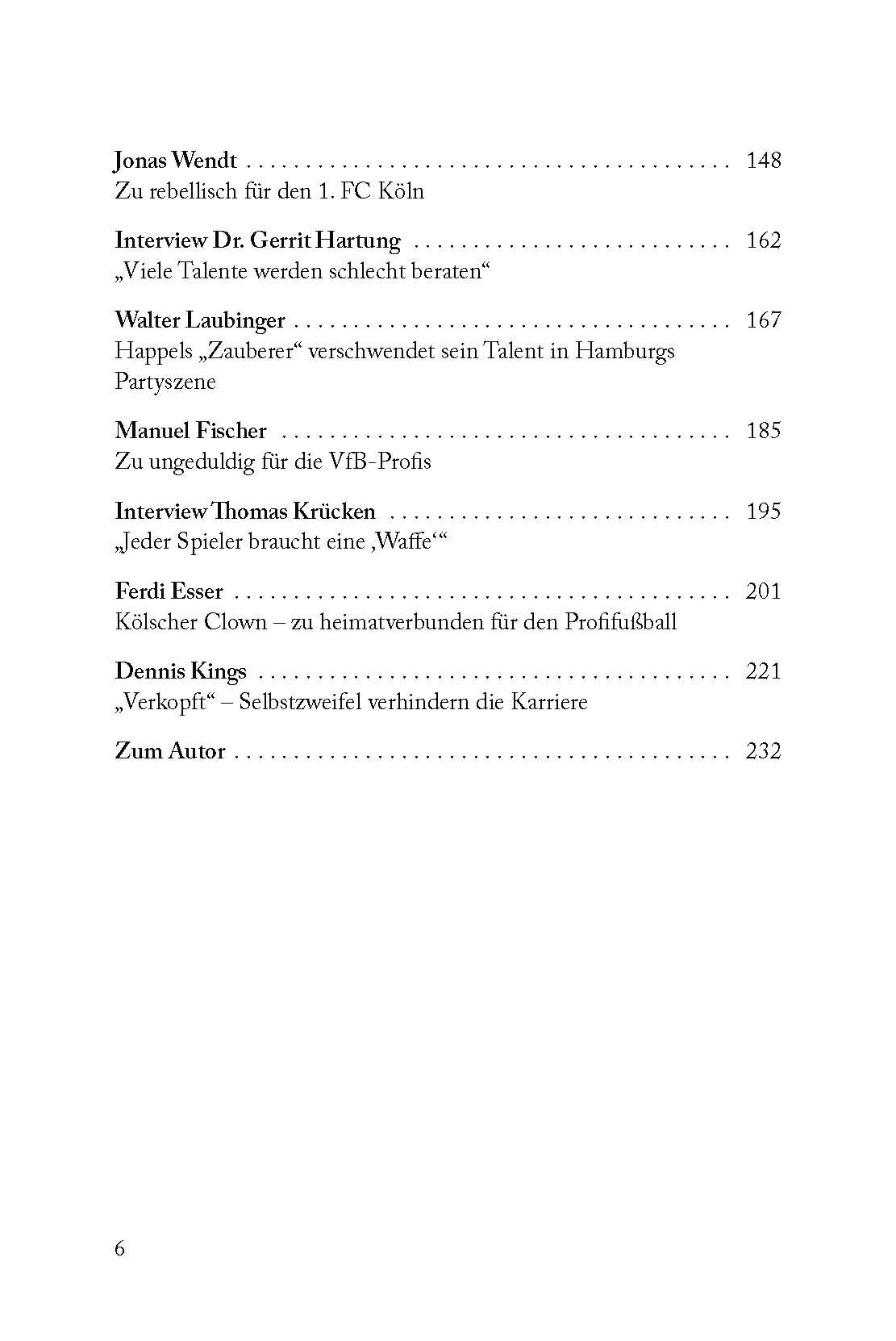 Vorwort Patrick Falk: Der FC Barcelona bleibt nur ein Traum Lucas Scholl: Der lange Schatten des Vaters Interview Joti Chatzialexiou: Uns fehlen die überragenden Einzelspieler Sergej Evljuskin: Plötzlich saß der Überflieger auf der Bank Jonas Ermes: Ich glaub, ich will das nicht mehr Interview Dr. René Paasch: Mentalität ist oft der entscheidende Faktor Damir Bektic: Kämpferisch auf dem Rasen, schwierig in der Kabine Heiko Hesse: Lieber Weltbank als Westfalenstadion Felix Casalino: YouTube-Star statt Fußballprofi Interview Prof. Dr. Oliver Höner: Müssen Talenten verschiedene Wege in den Profifußball bieten Fabio Dell'Era: Der Frühstarter ausgebremst beim SC Freiburg Jonas Wendt: Zu rebellisch für den 1. FC Köln Interview Dr. Gerrit Hartung: Viele Talente werden schlecht beraten Walter Laubinger: Happels Zauberer verschwendet sein Talent in Hamburgs Partyszene Manuel Fischer: Zu ungeduldig für die VfB-Profis Interview Thomas Krücken: Jeder Spieler braucht eine Waffe' Ferdi Esser: Kölscher Clown zu heimatverbunden für den Profifußball Dennis Kings: Verkopft Selbstzweifel verhindern die Karriere Zum Autor