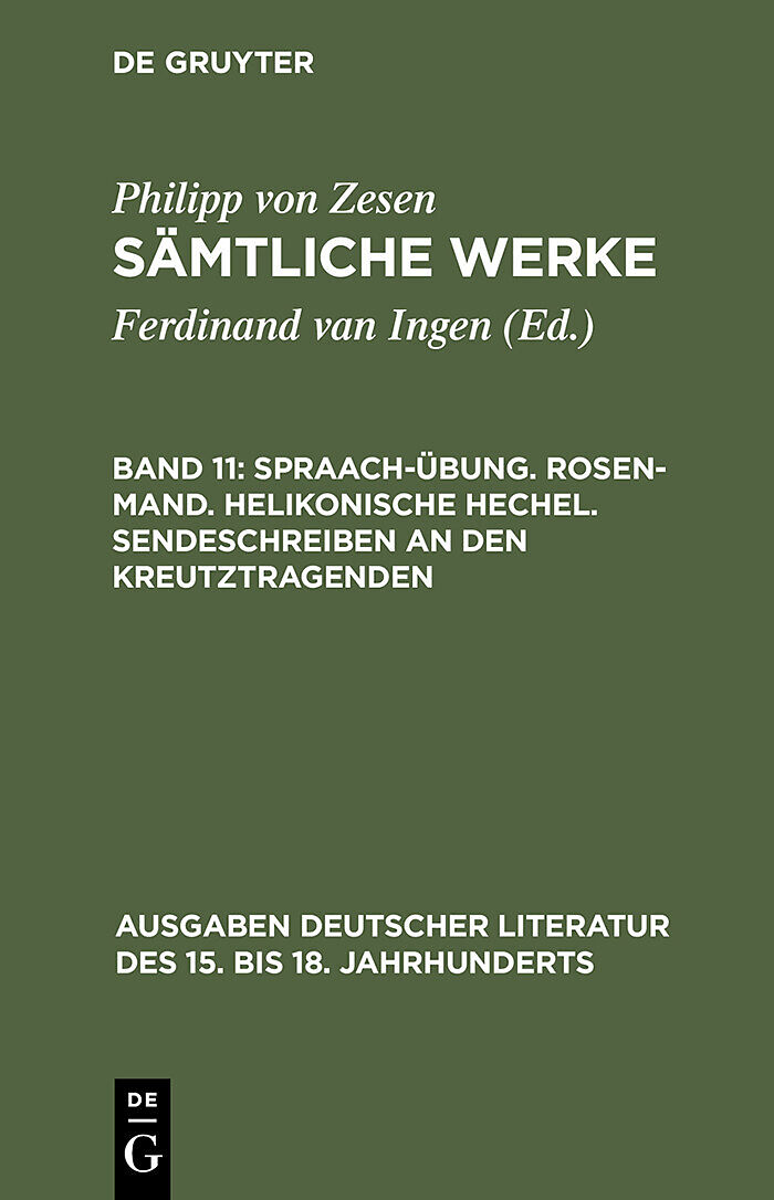Dieser Titel, "Spraach-Übung. Rosen-Mand. Helikonische Hechel. Sendeschreiben an den Kreutztragenden", ist eine wissenschaftliche Publikation, erschienen bei De Gruyter Brill. Ausführliche Beschreibung, Inhaltsverzeichnis und weitere Angaben finden Sie auf der...