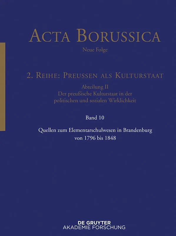 In 373 documents, the volume offers a practice-centered outline of conditions in the Prussian elementary school system between the end of the 18 th century and 1848 in the Province of Brandenburg. As part of the Academy project "Prussia as a Cultural State," ...