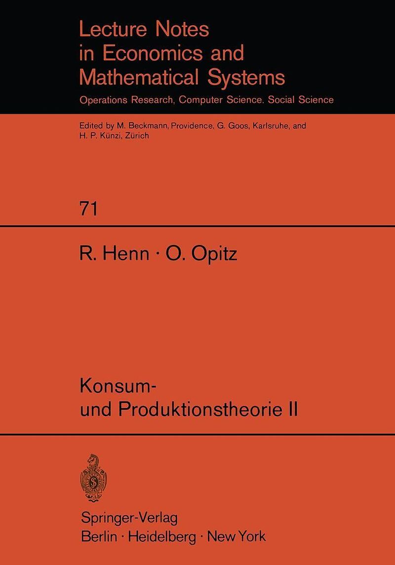 Inhalt III. Produktionstheorie.- 8. Einleitung.- 9. Das technische Optimierungsproblem und die Produktionsfunktion.- 10. Grenzproduktivitäten und Substitutionsgebiete.- 11. Kosten und Umsatz.- 12. Homogene Funktionen.- 13. Klassische Optimierungsverfahren.- 14...