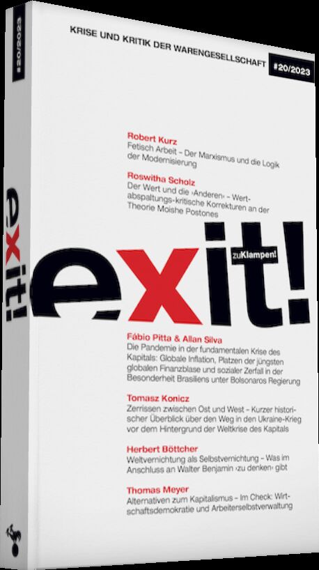 exit! übt postmarxistische Kritik an Warengesellschaft und Patriarchat im Sinne einer emanzipatorischen Transformation. exit! ist eine Zeitschrift für kritische Gesellschaftstheorie. Gesellschaftliche Entwicklungen analysiert sie auf der Grundlage der Kritik d...