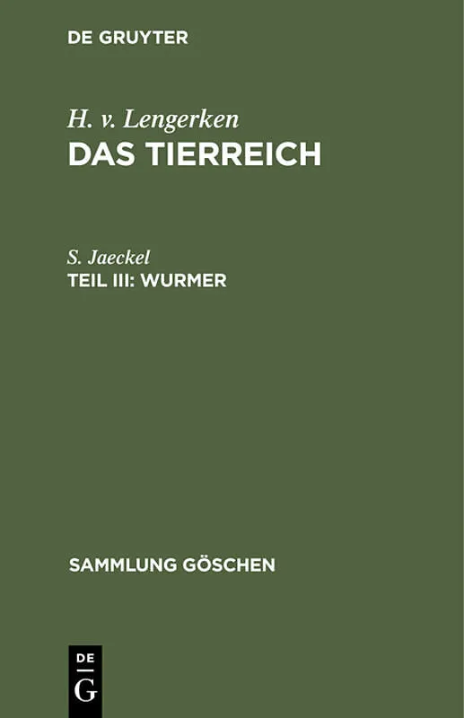 Frontmatter -- DAS TIERREICH IN DER SAMMLUNG GÖSCHEN -- STÄMME DES TIERREICHES -- INHALT -- EINLEITUNG -- 4. STAMM: PLATTWÜRMER (Plathelminthes) -- 5. STAMM: HOHL WÜRMER, RUNDWÜRMER (Aschelminthes, Nemathelminthes) -- 6. STAMM: SCHNURWÜRMER (Nemertini) -- 7. S...