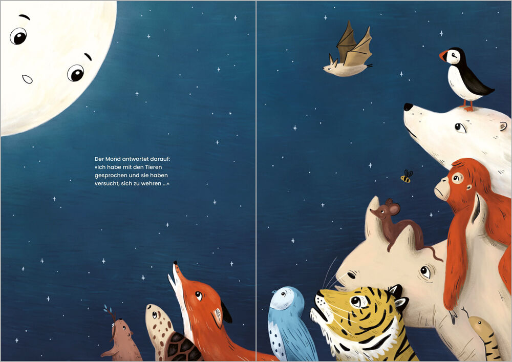 Mia liegt in ihrem Baumhaus und beobachtet den Mond. Was er ihr wohl sagen würde, wenn er sprechen könnte? Ob er Tiere auch so mag wie sie? Der Mond hat tatsächlich viel zu erzählen und Tiere liegen ihm sehr am Herzen. Doch es macht ihn traurig, dass die Mensc...