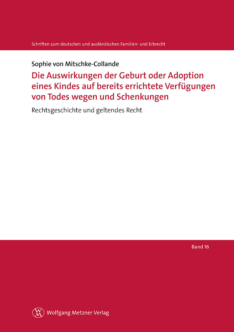 Gegenstand der Dissertation ist die rechtshistorische Aufarbeitung des Konflikts, der entsteht, wenn nach Errichtung eines Testaments, Abschluss eines Erbvertrages oder einer Schenkung dem Verfügenden ein Kind geboren wird. Beginnend mit dem römischen Recht w...Gegenstand der Dissertation ist die rechtshistorische Aufarbeitung des Konflikts, der entsteht, wenn nach Errichtung eines Testaments, Abschluss eines Erbvertrages oder einer Schenkung dem Verfügenden ein Kind geboren wird. Beginnend mit dem römischen Recht wird das gemeine sowie das preußische Recht auf die genannte Fragestellung hin untersucht. Anschließend rückt die Gesetzgebungsgeschichte zum Bürgerlichen Gesetzbuch (BGB) sowie deren Weiterentwicklung nach Inkrafttreten in den Fokus. Dabei wird stets über das Gebiet des Erbrechts hinaus auch das Schenkungsrecht in den Blick genommen.