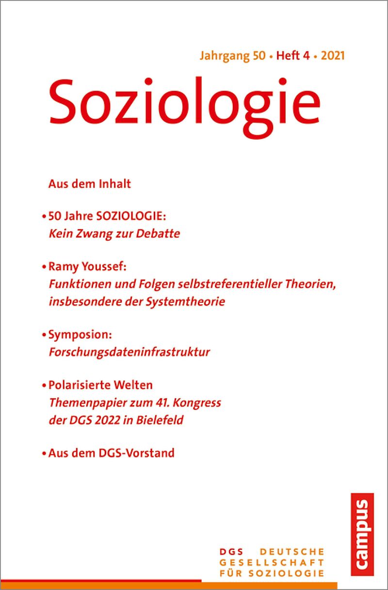 Die »Soziologie« ist das Forum der Deutschen Gesellschaft für Soziologie (DGS). Die Zeitschrift fördert die Diskussion über die Entwicklung des Fachs, informiert über die Einbindung der deutschen Soziologie in ihren europäischen und weltweiten Kontext und die...